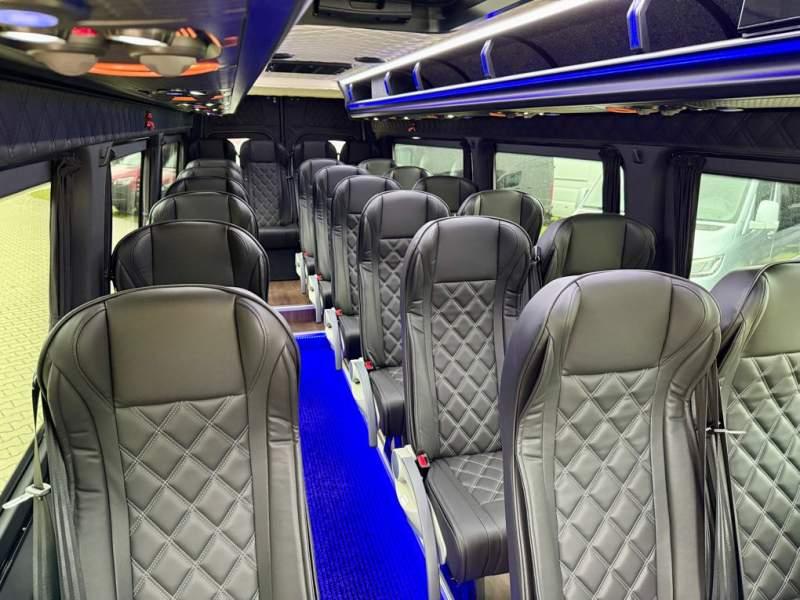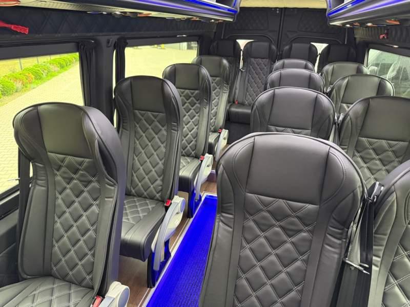 Fabrycznie nowy autobus Autobus dostępny od ręki ! Nr. oferty: 642 Mercedes-Benz Elegantbus Sprinter 519 EURO VI E 22+1+1 miejsc siedzących (Fotele zamontowane w szynach, możliwość zmiany na 19+1+1 miejsc i zwiększenie przestrzeni bagażowej) Wersja XXXL o długości 7, 87 m Pojemność: 1950 cm3 Pakiet stylistyczny Moc: 190 KM Rok produkcji: 2025 PODSTAWOWE I DODATKOWE WYPOSAŻENIE BAZOWE – ABS, SRS, ESP – Automatyczna 9 stopniowa skrzynia biegów – Reflektory przednie w technologii LED – Automatyczna zmiany świateł mijania - drogowe – Tylne lampy w technologii LED – Asystent utrzymania pasa ruchu – Tempo 100 km/h – Sensor świateł oraz deszczu – Tempomat – Kierownica wielofunkcyjna, trójramienna – Klimatyzacja dla kierowcy – Fotel kierowcy komfortowy z podłokietnikiem – Lusterko wsteczne – Asystent pasa ruchu FOTELE PRZEDZIAŁU PASAŻERSKIEGO – Komfortowe turystyczne fotele przedziału pasażerskiego (regulacja oparcia oraz przesuw boczny) – Fotele posiadają pasy bezpieczeństwa, podłokietniki, siateczki, stoliki, rączki, komfortowe zagłówki, – Fotele montowane na podestach – Fotel pilota na słupku B PRZESZKLENIE POJAZDU – Szyby podwójne, przyciemniane fabrycznie – Firanki przeciwsłoneczne na prowadnicach SYSTEMY GRZEWCZE – Konwektory grzewcze po lewej i prawej stronie – Ogrzewanie niezależne od pracy sinika mocy 5 kW z rozprowadzeniem KLIMATYZACJA – Automatyczna klimatyzacja dachowa o dużej wydajności 12, 5 KW OŚWIETLENIE – Oświetlenie indywidualne – Oświetlenie postojowe – Oświetlenie nocne – Podświetlane stopnie wejściowe – Podesty z podświetleniem LED – Lampy obrysowe dachowe MULTIMEDIA – System multimedialny MBUX 7, 5 ' – System Apple Car Play oraz Android Auto – Monitor podsufitowy 17 ' – Kamera Cofania – Mikrofon dynamiczny z potencjometrem – Nagłośnienie przestrzeni pasażerskiej PIONNER – Gniazda USB oraz USB C dla każdego rzędu siedzeń – Przetwornica 230v PRZECHOWYWANIE BAGAŻU I UBRAŃ – Turystyczne półki bagażowe – Pogłębiony tylny bagażnik – Wieszaki ubraniowe ELEMENTY BEZPIECZEŃSTWA – Podłoga antypoślizgowa PCV, odporna na ścieranie, wodoodporna – Szyberdach wentylacyjny / wyjście awaryjne – Młotki bezpieczeństwa – Dodatkowa gaśnica 2 kg ELEMENTY FUNKCJONALNE – Drzwi wejściowe elektryczne – Podwójny stopień wejściowy oświetlony LED – Przedłużenie pojazdu w tylnej części – Hak holowniczy z instalacją elektryczną – Lodówka 40 l LIFTING ZEWNĘTRZNY – Lakierowane zderzaki, listwy, klamki, lusterka i grill w kolorze pojazdu – Wszystkie dokładki lakierowane w kolor nadwozia Sprzedający: