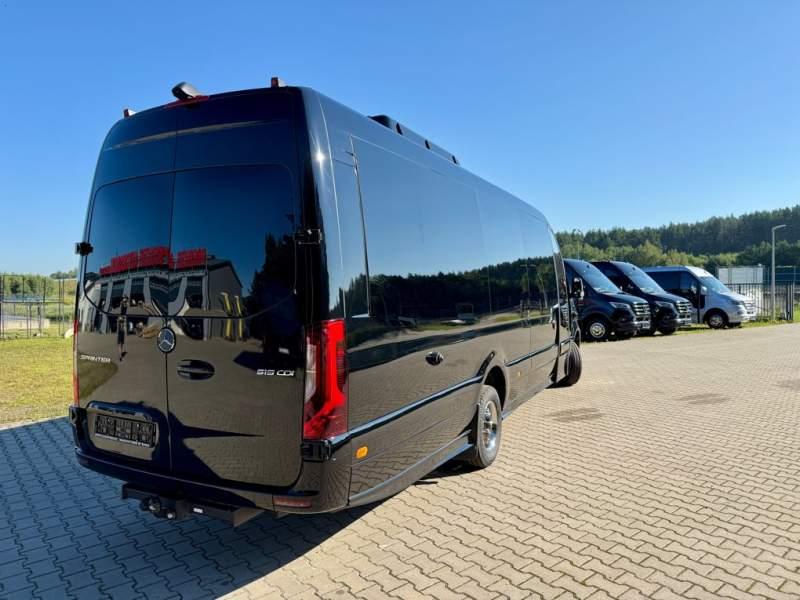 Fabrycznie nowy autobus Autobus dostępny od zaraz ! Nr. Oferty: 730 Mercedes-Benz Elegantbus Sprinter 519 EURO VI E GSR II 22+1+1 miejsc siedzących z możliwością szybkiej zmiany na 19+1+1 miejsc siedzących i zwiększenia przestrzeni bagażowej ! Wersja XXXL o długości 7, 87 m Pojemność: 1950 cm3 Pakiet stylistyczny Moc: 190 KM Rok produkcji: 2025 Kolor: Czarny PODSTAWOWE I DODATKOWE WYPOSAŻENIE BAZOWE – ABS, SRS, ESP – Wspomaganie kierownicy – Automatyczna 9 stopniowa skrzynia biegów – Centralny zamek, immobiliser – Reflektory przednie w technologii LED – Tylne lampy częściowo w technologii LED – Asystent utrzymania pasa ruchu – Tempo 100 km/h – Elektryczne szyby – Sensor świateł oraz deszczu – Tempomat – Kierownica wielofunkcyjna, trójramienna – Stabilizacja poziom II – Wzmocnione opony 205/75/R16C – Dogrzewacz elektryczny PTC – Klimatyzacja półautomatyczna TEMPTRONIC – Fotel kierowcy komfortowy z podłokietnikiem – Światła z funkcją świateł do jazdy dziennej – Lusterko wsteczne – Asystent pasa ruchu – Zamykany schowek na kokpicie – Akumulator AGM 12V 95 Ah – Lusterko wsteczne wewnętrzne – Zbiornik paliwa powiększony: 93 litry – Chlapacze przednie – Chlapacze tylnie FOTELE PRZEDZIAŁU PASAŻERSKIEGO – Komfortowe turystyczne fotele przedziału pasażerskiego (regulacja oparcia oraz przesuw boczny) – Fotele posiadają pasy bezpieczeństwa, podłokietniki, siateczki, stoliki, rączki, komfortowe zagłówki, – Fotele montowane na podestach – Fotel pilota na słupku B PRZESZKLENIE POJAZDU – Szyby podwójne, przyciemniane fabrycznie – Firanki przeciwsłoneczne na prowadnicach – Szyby drzwi elektrycznych podgrzewane SYSTEMY GRZEWCZE – Grzejniki konwektorowe wodne zainstalowane w przedziale pasażerskim po lewej i prawej stronie – Postojowe ogrzewanie wodne, oryginalne EBERSCHPRECHER 5 kW KLIMATYZACJA – Automatyczna Klimatyzacja dachowa WEBASTO 12, 5 kW OŚWIETLENIE – Oświetlenie indywidualne – Oświetlenie postojowe – Oświetlenie nocne – Podświetlane stopnie wejściowe – Podesty z podświetleniem LED – Lampy obrysowe dachowe LED MULTIMEDIA – System multimedialny MBUX 10, 5 cala – Oryginalna Kamera Cofania – Mikrofon – Nagłośnienie przestrzeni pasażerskiej PIONNER – Gniazda USB dla każdego rzędu siedzeń – Przetwornica 230v PRZECHOWYWANIE BAGAŻU I UBRAŃ – Turystyczne półki bagażowe – Lodówka o pojemności 40 litrów – Pogłębiony tylny bagażnik – Wieszaki ubraniowe ELEMENTY BEZPIECZEŃSTWA – Podłoga antypoślizgowa PCV, odporna na ścieranie, wodoodporna – Szyberdach wentylacyjny / wyjście awaryjne – Młotki bezpieczeństwa – Dodatkowa gaśnica 2 kg ELEMENTY FUNKCJONALNE – Elektryczne drzwi wejściowe sterowane z przycisku i pilota – Podwójny stopień wejściowy oświetlony LED – Przedłużenie pojazdu w tylnej części – Hak holowniczy LIFTING ZEWNĘTRZNY – Lakierowane zderzaki, listwy, klamki, lusterka i grill w kolorze pojazdu – Spojlery dolne w kolorze nadwozia Sprzedający: