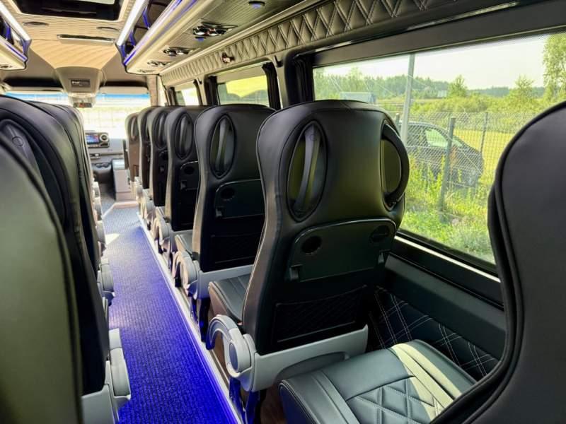 Fabrycznie nowy autobus Autobus dostępny od zaraz ! Nr. Oferty: 731 Mercedes-Benz Elegantbus Sprinter 519 EURO VI E GSR II 22+1+1 miejsc siedzących z możliwością szybkiej zmiany na 19+1+1 miejsc siedzących i zwiększenia przestrzeni bagażowej ! Wersja XXXL o długości 7, 87 m Pojemność: 1950 cm3 Pakiet stylistyczny Moc: 190 KM Rok produkcji: 2025 Kolor: Czarny PODSTAWOWE I DODATKOWE WYPOSAŻENIE BAZOWE – ABS, SRS, ESP – Wspomaganie kierownicy – Automatyczna 9 stopniowa skrzynia biegów – Centralny zamek, immobiliser – Reflektory przednie w technologii LED – Tylne lampy częściowo w technologii LED – Asystent utrzymania pasa ruchu – Tempo 100 km/h – Elektryczne szyby – Sensor świateł oraz deszczu – Tempomat – Kierownica wielofunkcyjna, trójramienna – Stabilizacja poziom II – Wzmocnione opony 205/75/R16C – Dogrzewacz elektryczny PTC – Klimatyzacja półautomatyczna TEMPTRONIC – Fotel kierowcy komfortowy z podłokietnikiem – Światła z funkcją świateł do jazdy dziennej – Lusterko wsteczne – Asystent pasa ruchu – Zamykany schowek na kokpicie – Akumulator AGM 12V 95 Ah – Lusterko wsteczne wewnętrzne – Zbiornik paliwa powiększony: 93 litry – Chlapacze przednie – Chlapacze tylnie FOTELE PRZEDZIAŁU PASAŻERSKIEGO – Komfortowe turystyczne fotele przedziału pasażerskiego (regulacja oparcia oraz przesuw boczny) – Fotele posiadają pasy bezpieczeństwa, podłokietniki, siateczki, stoliki, rączki, komfortowe zagłówki, – Fotele montowane na podestach – Fotel pilota na słupku B PRZESZKLENIE POJAZDU – Szyby podwójne, przyciemniane fabrycznie – Firanki przeciwsłoneczne na prowadnicach – Szyby drzwi elektrycznych podgrzewane SYSTEMY GRZEWCZE – Grzejniki konwektorowe wodne zainstalowane w przedziale pasażerskim po lewej i prawej stronie – Postojowe ogrzewanie wodne, oryginalne EBERSCHPRECHER 5 kW KLIMATYZACJA – Automatyczna Klimatyzacja dachowa WEBASTO 12, 5 kW OŚWIETLENIE – Oświetlenie indywidualne – Oświetlenie postojowe – Oświetlenie nocne – Podświetlane stopnie wejściowe – Podesty z podświetleniem LED – Lampy obrysowe dachowe LED MULTIMEDIA – System multimedialny MBUX 10, 5 cala – Oryginalna Kamera Cofania – Mikrofon – Nagłośnienie przestrzeni pasażerskiej PIONNER – Gniazda USB dla każdego rzędu siedzeń – Przetwornica 230v PRZECHOWYWANIE BAGAŻU I UBRAŃ – Turystyczne półki bagażowe – Lodówka o pojemności 40 litrów – Pogłębiony tylny bagażnik – Wieszaki ubraniowe ELEMENTY BEZPIECZEŃSTWA – Podłoga antypoślizgowa PCV, odporna na ścieranie, wodoodporna – Szyberdach wentylacyjny / wyjście awaryjne – Młotki bezpieczeństwa – Dodatkowa gaśnica 2 kg ELEMENTY FUNKCJONALNE – Elektryczne drzwi wejściowe sterowane z przycisku i pilota – Podwójny stopień wejściowy oświetlony LED – Przedłużenie pojazdu w tylnej części – Hak holowniczy LIFTING ZEWNĘTRZNY – Lakierowane zderzaki, listwy, klamki, lusterka i grill w kolorze pojazdu – Spojlery dolne w kolorze nadwozia Sprzedający: