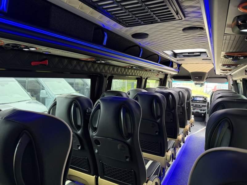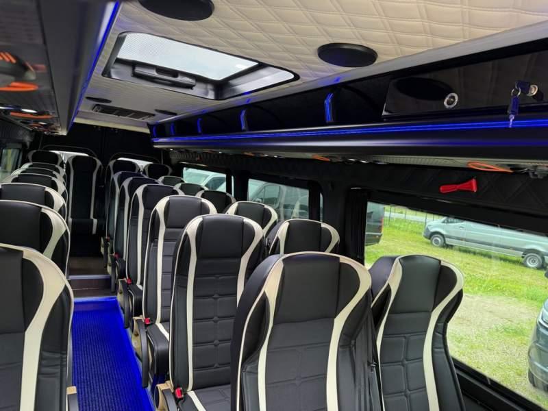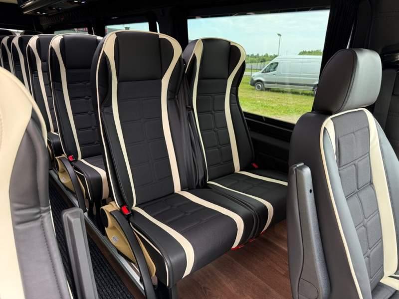 Fabrycznie nowy autobus Autobus dostępny od zaraz ! Nr. oferty: 644 Mercedes-Benz Elegantbus Sprinter 519 EURO VI E GSR II 22+1+1 miejsc siedzących z możliwością szybkiej zmiany na 19+1+1 miejsc siedzących i zwiększenia przestrzeni bagażowej ! Wersja XXXL o długości 7, 87 m Pojemność: 1950 cm3 Pakiet stylistyczny Moc: 190 KM Rok produkcji: 2025 Kolor: Czarny PODSTAWOWE I DODATKOWE WYPOSAŻENIE BAZOWE – ABS, SRS, ESP – Wspomaganie kierownicy – Automatyczna 9 stopniowa skrzynia biegów – Centralny zamek, immobiliser – Reflektory przednie w technologii LED – Tylne lampy częściowo w technologii LED – Asystent utrzymania pasa ruchu – Tempo 100 km/h – Elektryczne szyby – Sensor świateł oraz deszczu – Tempomat – Kierownica wielofunkcyjna, trójramienna – Stabilizacja poziom II – Wzmocnione opony 205/75/R16C – Dogrzewacz elektryczny PTC – Klimatyzacja półautomatyczna TEMPTRONIC – Fotel kierowcy komfortowy z podłokietnikiem – Światła z funkcją świateł do jazdy dziennej – Lusterko wsteczne – Asystent pasa ruchu – Zamykany schowek na kokpicie – Akumulator AGM 12V 95 Ah – Lusterko wsteczne wewnętrzne – Zbiornik paliwa powiększony: 93 litry – Chlapacze przednie – Chlapacze tylnie FOTELE PRZEDZIAŁU PASAŻERSKIEGO – Komfortowe turystyczne fotele przedziału pasażerskiego (regulacja oparcia oraz przesuw boczny) – Fotele posiadają pasy bezpieczeństwa, podłokietniki, siateczki, stoliki, rączki, komfortowe zagłówki, – Fotele montowane na podestach – Fotel pilota na słupku B PRZESZKLENIE POJAZDU – Szyby podwójne, przyciemniane fabrycznie – Firanki przeciwsłoneczne na prowadnicach – Szyby drzwi elektrycznych podgrzewane SYSTEMY GRZEWCZE – Grzejniki konwektorowe wodne zainstalowane w przedziale pasażerskim po lewej i prawej stronie – Postojowe ogrzewanie wodne, oryginalne EBERSCHPRECHER 5 kW KLIMATYZACJA – Automatyczna Klimatyzacja dachowa WEBASTO 12, 5 kW OŚWIETLENIE – Oświetlenie indywidualne – Oświetlenie postojowe – Oświetlenie nocne – Podświetlane stopnie wejściowe – Podesty z podświetleniem LED – Lampy obrysowe dachowe LED MULTIMEDIA – System multimedialny MBUX 10, 5 cala – Oryginalna Kamera Cofania – Mikrofon – Nagłośnienie przestrzeni pasażerskiej PIONNER – Gniazda USB dla każdego rzędu siedzeń – Przetwornica 230v PRZECHOWYWANIE BAGAŻU I UBRAŃ – Turystyczne półki bagażowe – Lodówka o pojemności 40 litrów – Pogłębiony tylny bagażnik – Wieszaki ubraniowe ELEMENTY BEZPIECZEŃSTWA – Podłoga antypoślizgowa PCV, odporna na ścieranie, wodoodporna – Szyberdach wentylacyjny / wyjście awaryjne – Młotki bezpieczeństwa – Dodatkowa gaśnica 2 kg ELEMENTY FUNKCJONALNE – Elektryczne drzwi wejściowe sterowane z przycisku i pilota – Podwójny stopień wejściowy oświetlony LED – Przedłużenie pojazdu w tylnej części – Hak holowniczy LIFTING ZEWNĘTRZNY – Lakierowane zderzaki, listwy, klamki, lusterka i grill w kolorze pojazdu – Spojlery dolne w kolorze nadwozia Sprzedający: