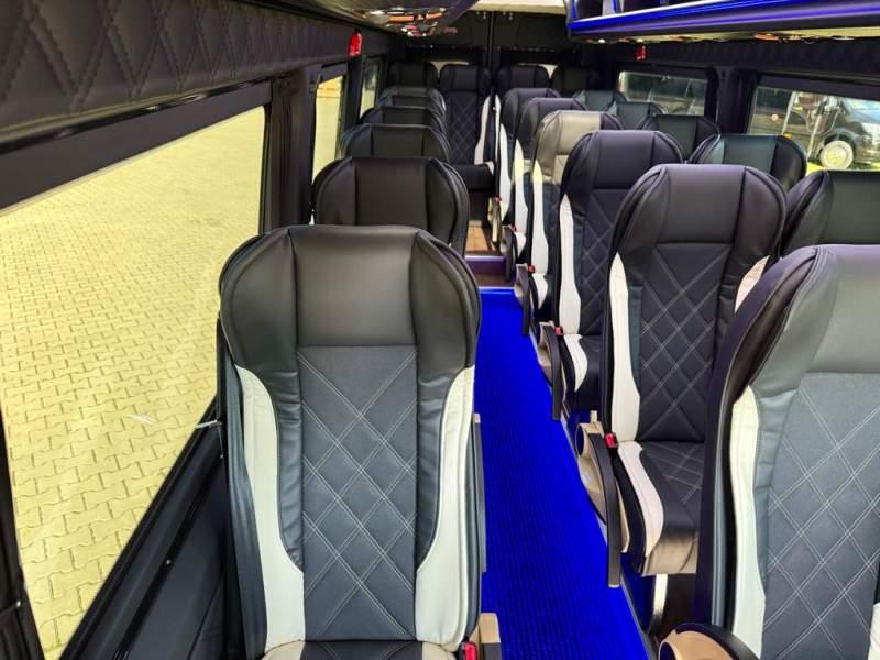Fabrycznie nowy autobus Autobus dostępny od zaraz ! Nr. Oferty: 730 Mercedes-Benz Elegantbus Sprinter 519 EURO VI E GSR II 22+1+1 miejsc siedzących z możliwością szybkiej zmiany na 19+1+1 miejsc siedzących i zwiększenia przestrzeni bagażowej ! Wersja XXXL o długości 7, 87 m Pojemność: 1950 cm3 Pakiet stylistyczny Moc: 190 KM Rok produkcji: 2025 Kolor: Czarny PODSTAWOWE I DODATKOWE WYPOSAŻENIE BAZOWE – ABS, SRS, ESP – Wspomaganie kierownicy – Automatyczna 9 stopniowa skrzynia biegów – Centralny zamek, immobiliser – Reflektory przednie w technologii LED – Tylne lampy częściowo w technologii LED – Asystent utrzymania pasa ruchu – Tempo 100 km/h – Elektryczne szyby – Sensor świateł oraz deszczu – Tempomat – Kierownica wielofunkcyjna, trójramienna – Stabilizacja poziom II – Wzmocnione opony 205/75/R16C – Dogrzewacz elektryczny PTC – Klimatyzacja półautomatyczna TEMPTRONIC – Fotel kierowcy komfortowy z podłokietnikiem – Światła z funkcją świateł do jazdy dziennej – Lusterko wsteczne – Asystent pasa ruchu – Zamykany schowek na kokpicie – Akumulator AGM 12V 95 Ah – Lusterko wsteczne wewnętrzne – Zbiornik paliwa powiększony: 93 litry – Chlapacze przednie – Chlapacze tylnie FOTELE PRZEDZIAŁU PASAŻERSKIEGO – Komfortowe turystyczne fotele przedziału pasażerskiego (regulacja oparcia oraz przesuw boczny) – Fotele posiadają pasy bezpieczeństwa, podłokietniki, siateczki, stoliki, rączki, komfortowe zagłówki, – Fotele montowane na podestach – Fotel pilota na słupku B PRZESZKLENIE POJAZDU – Szyby podwójne, przyciemniane fabrycznie – Firanki przeciwsłoneczne na prowadnicach – Szyby drzwi elektrycznych podgrzewane SYSTEMY GRZEWCZE – Grzejniki konwektorowe wodne zainstalowane w przedziale pasażerskim po lewej i prawej stronie – Postojowe ogrzewanie wodne, oryginalne EBERSCHPRECHER 5 kW KLIMATYZACJA – Automatyczna Klimatyzacja dachowa WEBASTO 12, 5 kW OŚWIETLENIE – Oświetlenie indywidualne – Oświetlenie postojowe – Oświetlenie nocne – Podświetlane stopnie wejściowe – Podesty z podświetleniem LED – Lampy obrysowe dachowe LED MULTIMEDIA – System multimedialny MBUX 10, 5 cala – Oryginalna Kamera Cofania – Mikrofon – Nagłośnienie przestrzeni pasażerskiej PIONNER – Gniazda USB dla każdego rzędu siedzeń – Przetwornica 230v PRZECHOWYWANIE BAGAŻU I UBRAŃ – Turystyczne półki bagażowe – Lodówka o pojemności 40 litrów – Pogłębiony tylny bagażnik – Wieszaki ubraniowe ELEMENTY BEZPIECZEŃSTWA – Podłoga antypoślizgowa PCV, odporna na ścieranie, wodoodporna – Szyberdach wentylacyjny / wyjście awaryjne – Młotki bezpieczeństwa – Dodatkowa gaśnica 2 kg ELEMENTY FUNKCJONALNE – Elektryczne drzwi wejściowe sterowane z przycisku i pilota – Podwójny stopień wejściowy oświetlony LED – Przedłużenie pojazdu w tylnej części – Hak holowniczy LIFTING ZEWNĘTRZNY – Lakierowane zderzaki, listwy, klamki, lusterka i grill w kolorze pojazdu – Spojlery dolne w kolorze nadwozia Sprzedający: