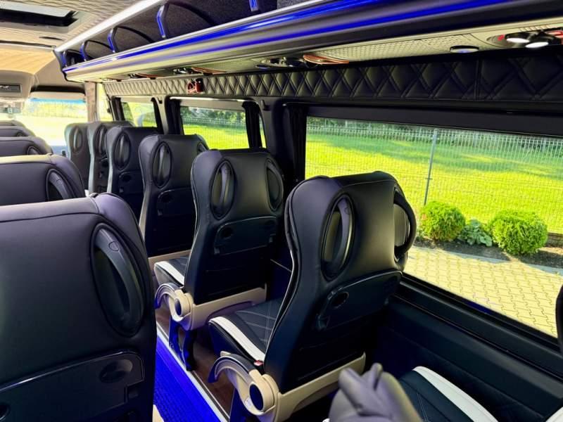 Fabrycznie nowy autobus Autobus dostępny od zaraz ! Nr. Oferty: 730 Mercedes-Benz Elegantbus Sprinter 519 EURO VI E GSR II 22+1+1 miejsc siedzących z możliwością szybkiej zmiany na 19+1+1 miejsc siedzących i zwiększenia przestrzeni bagażowej ! Wersja XXXL o długości 7, 87 m Pojemność: 1950 cm3 Pakiet stylistyczny Moc: 190 KM Rok produkcji: 2025 Kolor: Czarny PODSTAWOWE I DODATKOWE WYPOSAŻENIE BAZOWE – ABS, SRS, ESP – Wspomaganie kierownicy – Automatyczna 9 stopniowa skrzynia biegów – Centralny zamek, immobiliser – Reflektory przednie w technologii LED – Tylne lampy częściowo w technologii LED – Asystent utrzymania pasa ruchu – Tempo 100 km/h – Elektryczne szyby – Sensor świateł oraz deszczu – Tempomat – Kierownica wielofunkcyjna, trójramienna – Stabilizacja poziom II – Wzmocnione opony 205/75/R16C – Dogrzewacz elektryczny PTC – Klimatyzacja półautomatyczna TEMPTRONIC – Fotel kierowcy komfortowy z podłokietnikiem – Światła z funkcją świateł do jazdy dziennej – Lusterko wsteczne – Asystent pasa ruchu – Zamykany schowek na kokpicie – Akumulator AGM 12V 95 Ah – Lusterko wsteczne wewnętrzne – Zbiornik paliwa powiększony: 93 litry – Chlapacze przednie – Chlapacze tylnie FOTELE PRZEDZIAŁU PASAŻERSKIEGO – Komfortowe turystyczne fotele przedziału pasażerskiego (regulacja oparcia oraz przesuw boczny) – Fotele posiadają pasy bezpieczeństwa, podłokietniki, siateczki, stoliki, rączki, komfortowe zagłówki, – Fotele montowane na podestach – Fotel pilota na słupku B PRZESZKLENIE POJAZDU – Szyby podwójne, przyciemniane fabrycznie – Firanki przeciwsłoneczne na prowadnicach – Szyby drzwi elektrycznych podgrzewane SYSTEMY GRZEWCZE – Grzejniki konwektorowe wodne zainstalowane w przedziale pasażerskim po lewej i prawej stronie – Postojowe ogrzewanie wodne, oryginalne EBERSCHPRECHER 5 kW KLIMATYZACJA – Automatyczna Klimatyzacja dachowa WEBASTO 12, 5 kW OŚWIETLENIE – Oświetlenie indywidualne – Oświetlenie postojowe – Oświetlenie nocne – Podświetlane stopnie wejściowe – Podesty z podświetleniem LED – Lampy obrysowe dachowe LED MULTIMEDIA – System multimedialny MBUX 10, 5 cala – Oryginalna Kamera Cofania – Mikrofon – Nagłośnienie przestrzeni pasażerskiej PIONNER – Gniazda USB dla każdego rzędu siedzeń – Przetwornica 230v PRZECHOWYWANIE BAGAŻU I UBRAŃ – Turystyczne półki bagażowe – Lodówka o pojemności 40 litrów – Pogłębiony tylny bagażnik – Wieszaki ubraniowe ELEMENTY BEZPIECZEŃSTWA – Podłoga antypoślizgowa PCV, odporna na ścieranie, wodoodporna – Szyberdach wentylacyjny / wyjście awaryjne – Młotki bezpieczeństwa – Dodatkowa gaśnica 2 kg ELEMENTY FUNKCJONALNE – Elektryczne drzwi wejściowe sterowane z przycisku i pilota – Podwójny stopień wejściowy oświetlony LED – Przedłużenie pojazdu w tylnej części – Hak holowniczy LIFTING ZEWNĘTRZNY – Lakierowane zderzaki, listwy, klamki, lusterka i grill w kolorze pojazdu – Spojlery dolne w kolorze nadwozia Sprzedający: