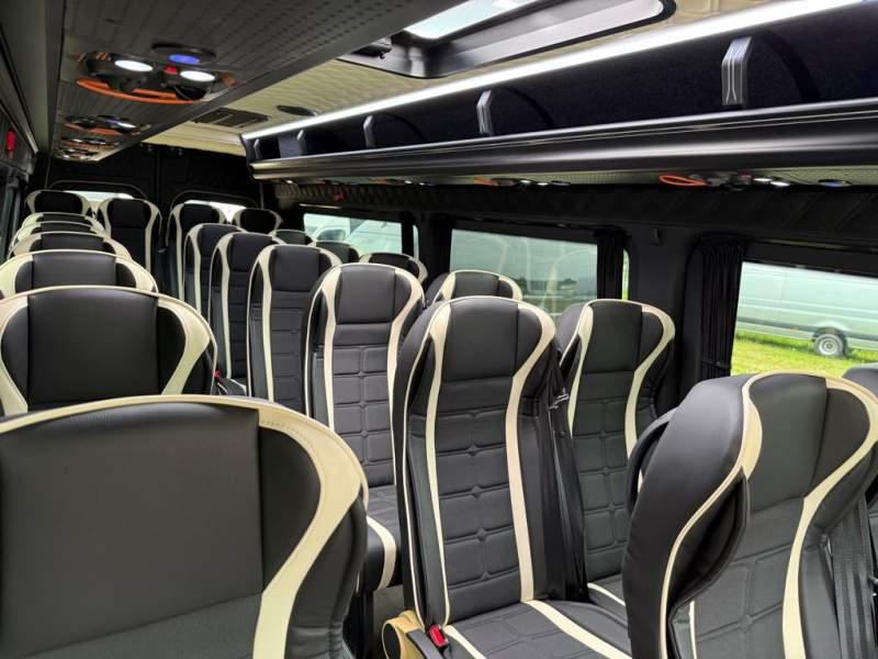Fabrycznie nowy autobus Autobus dostępny od zaraz ! Nr. oferty: 644 Mercedes-Benz Elegantbus Sprinter 519 EURO VI E GSR II 22+1+1 miejsc siedzących z możliwością szybkiej zmiany na 19+1+1 miejsc siedzących i zwiększenia przestrzeni bagażowej ! Wersja XXXL o długości 7, 87 m Pojemność: 1950 cm3 Pakiet stylistyczny Moc: 190 KM Rok produkcji: 2025 Kolor: Czarny PODSTAWOWE I DODATKOWE WYPOSAŻENIE BAZOWE – ABS, SRS, ESP – Wspomaganie kierownicy – Automatyczna 9 stopniowa skrzynia biegów – Centralny zamek, immobiliser – Reflektory przednie w technologii LED – Tylne lampy częściowo w technologii LED – Asystent utrzymania pasa ruchu – Tempo 100 km/h – Elektryczne szyby – Sensor świateł oraz deszczu – Tempomat – Kierownica wielofunkcyjna, trójramienna – Stabilizacja poziom II – Wzmocnione opony 205/75/R16C – Dogrzewacz elektryczny PTC – Klimatyzacja półautomatyczna TEMPTRONIC – Fotel kierowcy komfortowy z podłokietnikiem – Światła z funkcją świateł do jazdy dziennej – Lusterko wsteczne – Asystent pasa ruchu – Zamykany schowek na kokpicie – Akumulator AGM 12V 95 Ah – Lusterko wsteczne wewnętrzne – Zbiornik paliwa powiększony: 93 litry – Chlapacze przednie – Chlapacze tylnie FOTELE PRZEDZIAŁU PASAŻERSKIEGO – Komfortowe turystyczne fotele przedziału pasażerskiego (regulacja oparcia oraz przesuw boczny) – Fotele posiadają pasy bezpieczeństwa, podłokietniki, siateczki, stoliki, rączki, komfortowe zagłówki, – Fotele montowane na podestach – Fotel pilota na słupku B PRZESZKLENIE POJAZDU – Szyby podwójne, przyciemniane fabrycznie – Firanki przeciwsłoneczne na prowadnicach – Szyby drzwi elektrycznych podgrzewane SYSTEMY GRZEWCZE – Grzejniki konwektorowe wodne zainstalowane w przedziale pasażerskim po lewej i prawej stronie – Postojowe ogrzewanie wodne, oryginalne EBERSCHPRECHER 5 kW KLIMATYZACJA – Automatyczna Klimatyzacja dachowa WEBASTO 12, 5 kW OŚWIETLENIE – Oświetlenie indywidualne – Oświetlenie postojowe – Oświetlenie nocne – Podświetlane stopnie wejściowe – Podesty z podświetleniem LED – Lampy obrysowe dachowe LED MULTIMEDIA – System multimedialny MBUX 10, 5 cala – Oryginalna Kamera Cofania – Mikrofon – Nagłośnienie przestrzeni pasażerskiej PIONNER – Gniazda USB dla każdego rzędu siedzeń – Przetwornica 230v PRZECHOWYWANIE BAGAŻU I UBRAŃ – Turystyczne półki bagażowe – Lodówka o pojemności 40 litrów – Pogłębiony tylny bagażnik – Wieszaki ubraniowe ELEMENTY BEZPIECZEŃSTWA – Podłoga antypoślizgowa PCV, odporna na ścieranie, wodoodporna – Szyberdach wentylacyjny / wyjście awaryjne – Młotki bezpieczeństwa – Dodatkowa gaśnica 2 kg ELEMENTY FUNKCJONALNE – Elektryczne drzwi wejściowe sterowane z przycisku i pilota – Podwójny stopień wejściowy oświetlony LED – Przedłużenie pojazdu w tylnej części – Hak holowniczy LIFTING ZEWNĘTRZNY – Lakierowane zderzaki, listwy, klamki, lusterka i grill w kolorze pojazdu – Spojlery dolne w kolorze nadwozia Sprzedający: