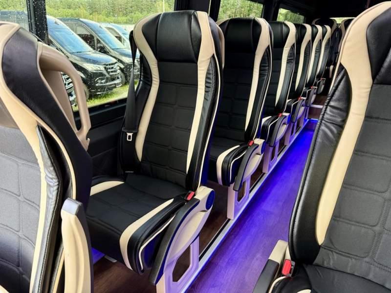 Fabrycznie nowy autobus Autobus dostępny od ręki ! Nr. oferty: 100 Mercedes-Benz Elegantbus Sprinter 519 EURO VI E 22+1+1 miejsc siedzących (Fotele zamontowane w szynach, możliwość zmiany na 19+1+1 miejsc i zwiększenie przestrzeni bagażowej) Wersja XXXL o długości 7, 87 m Pojemność: 1950 cm3 Pakiet stylistyczny Moc: 190 KM Rok produkcji: 2025 PODSTAWOWE I DODATKOWE WYPOSAŻENIE BAZOWE – ABS, SRS, ESP – Automatyczna 9 stopniowa skrzynia biegów – Reflektory przednie w technologii LED – Automatyczna zmiany świateł mijania - drogowe – Tylne lampy w technologii LED – Asystent utrzymania pasa ruchu – Tempo 100 km/h – Sensor świateł oraz deszczu – Tempomat – Kierownica wielofunkcyjna, trójramienna – Klimatyzacja dla kierowcy – Fotel kierowcy komfortowy z podłokietnikiem – Lusterko wsteczne – Asystent pasa ruchu FOTELE PRZEDZIAŁU PASAŻERSKIEGO – Komfortowe turystyczne fotele przedziału pasażerskiego (regulacja oparcia oraz przesuw boczny) – Fotele posiadają pasy bezpieczeństwa, podłokietniki, siateczki, stoliki, rączki, komfortowe zagłówki, – Fotele montowane na podestach – Fotel pilota na słupku B PRZESZKLENIE POJAZDU – Szyby podwójne, przyciemniane fabrycznie – Firanki przeciwsłoneczne na prowadnicach SYSTEMY GRZEWCZE – Konwektory grzewcze po lewej i prawej stronie – Ogrzewanie niezależne od pracy sinika mocy 5 kW z rozprowadzeniem KLIMATYZACJA – Automatyczna klimatyzacja dachowa o dużej wydajności 12, 5 KW OŚWIETLENIE – Oświetlenie indywidualne – Oświetlenie postojowe – Oświetlenie nocne – Podświetlane stopnie wejściowe – Podesty z podświetleniem LED – Lampy obrysowe dachowe MULTIMEDIA – System multimedialny MBUX 7, 5 ' – System Apple Car Play oraz Android Auto – Monitor podsufitowy 17 ' – Kamera Cofania – Mikrofon dynamiczny z potencjometrem – Nagłośnienie przestrzeni pasażerskiej PIONNER – Gniazda USB oraz USB C dla każdego rzędu siedzeń – Przetwornica 230v PRZECHOWYWANIE BAGAŻU I UBRAŃ – Turystyczne półki bagażowe – Pogłębiony tylny bagażnik – Wieszaki ubraniowe ELEMENTY BEZPIECZEŃSTWA – Podłoga antypoślizgowa PCV, odporna na ścieranie, wodoodporna – Szyberdach wentylacyjny / wyjście awaryjne – Młotki bezpieczeństwa – Dodatkowa gaśnica 2 kg ELEMENTY FUNKCJONALNE – Drzwi wejściowe elektryczne – Podwójny stopień wejściowy oświetlony LED – Przedłużenie pojazdu w tylnej części – Hak holowniczy z instalacją elektryczną – Lodówka 40 l LIFTING ZEWNĘTRZNY – Lakierowane zderzaki, listwy, klamki, lusterka i grill w kolorze pojazdu – Wszystkie dokładki lakierowane w kolor nadwozia Sprzedający: