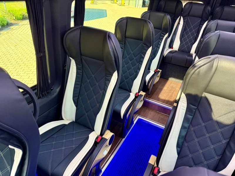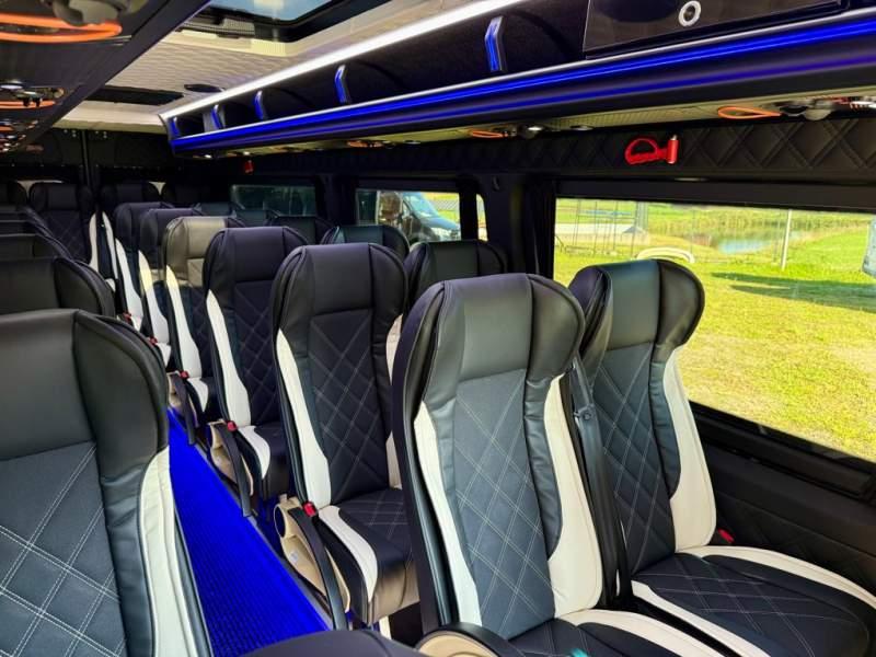 Fabrycznie nowy autobus Autobus dostępny od zaraz ! Nr. Oferty: 730 Mercedes-Benz Elegantbus Sprinter 519 EURO VI E GSR II 22+1+1 miejsc siedzących z możliwością szybkiej zmiany na 19+1+1 miejsc siedzących i zwiększenia przestrzeni bagażowej ! Wersja XXXL o długości 7, 87 m Pojemność: 1950 cm3 Pakiet stylistyczny Moc: 190 KM Rok produkcji: 2025 Kolor: Czarny PODSTAWOWE I DODATKOWE WYPOSAŻENIE BAZOWE – ABS, SRS, ESP – Wspomaganie kierownicy – Automatyczna 9 stopniowa skrzynia biegów – Centralny zamek, immobiliser – Reflektory przednie w technologii LED – Tylne lampy częściowo w technologii LED – Asystent utrzymania pasa ruchu – Tempo 100 km/h – Elektryczne szyby – Sensor świateł oraz deszczu – Tempomat – Kierownica wielofunkcyjna, trójramienna – Stabilizacja poziom II – Wzmocnione opony 205/75/R16C – Dogrzewacz elektryczny PTC – Klimatyzacja półautomatyczna TEMPTRONIC – Fotel kierowcy komfortowy z podłokietnikiem – Światła z funkcją świateł do jazdy dziennej – Lusterko wsteczne – Asystent pasa ruchu – Zamykany schowek na kokpicie – Akumulator AGM 12V 95 Ah – Lusterko wsteczne wewnętrzne – Zbiornik paliwa powiększony: 93 litry – Chlapacze przednie – Chlapacze tylnie FOTELE PRZEDZIAŁU PASAŻERSKIEGO – Komfortowe turystyczne fotele przedziału pasażerskiego (regulacja oparcia oraz przesuw boczny) – Fotele posiadają pasy bezpieczeństwa, podłokietniki, siateczki, stoliki, rączki, komfortowe zagłówki, – Fotele montowane na podestach – Fotel pilota na słupku B PRZESZKLENIE POJAZDU – Szyby podwójne, przyciemniane fabrycznie – Firanki przeciwsłoneczne na prowadnicach – Szyby drzwi elektrycznych podgrzewane SYSTEMY GRZEWCZE – Grzejniki konwektorowe wodne zainstalowane w przedziale pasażerskim po lewej i prawej stronie – Postojowe ogrzewanie wodne, oryginalne EBERSCHPRECHER 5 kW KLIMATYZACJA – Automatyczna Klimatyzacja dachowa WEBASTO 12, 5 kW OŚWIETLENIE – Oświetlenie indywidualne – Oświetlenie postojowe – Oświetlenie nocne – Podświetlane stopnie wejściowe – Podesty z podświetleniem LED – Lampy obrysowe dachowe LED MULTIMEDIA – System multimedialny MBUX 10, 5 cala – Oryginalna Kamera Cofania – Mikrofon – Nagłośnienie przestrzeni pasażerskiej PIONNER – Gniazda USB dla każdego rzędu siedzeń – Przetwornica 230v PRZECHOWYWANIE BAGAŻU I UBRAŃ – Turystyczne półki bagażowe – Lodówka o pojemności 40 litrów – Pogłębiony tylny bagażnik – Wieszaki ubraniowe ELEMENTY BEZPIECZEŃSTWA – Podłoga antypoślizgowa PCV, odporna na ścieranie, wodoodporna – Szyberdach wentylacyjny / wyjście awaryjne – Młotki bezpieczeństwa – Dodatkowa gaśnica 2 kg ELEMENTY FUNKCJONALNE – Elektryczne drzwi wejściowe sterowane z przycisku i pilota – Podwójny stopień wejściowy oświetlony LED – Przedłużenie pojazdu w tylnej części – Hak holowniczy LIFTING ZEWNĘTRZNY – Lakierowane zderzaki, listwy, klamki, lusterka i grill w kolorze pojazdu – Spojlery dolne w kolorze nadwozia Sprzedający: