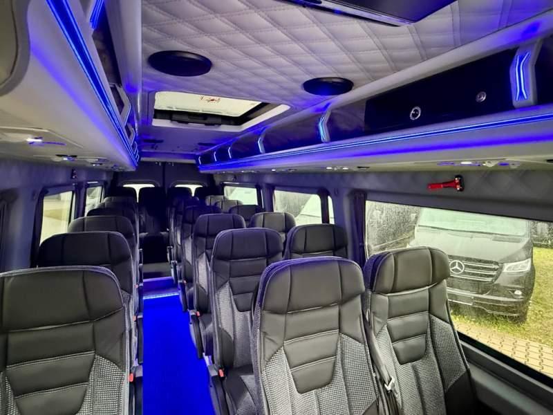 Fabrycznie nowy autobus Autobus dostępny od ręki ! Nr. oferty: 148 Mercedes-Benz Elegantbus Sprinter 519 EURO VI E 22+1+1 miejsc siedzących (Fotele zamontowane w szynach, możliwość zmiany na 19+1+1 miejsc i zwiększenie przestrzeni bagażowej) Wersja XXXL o długości 7, 87 m Pojemność: 1950 cm3 Pakiet stylistyczny Moc: 190 KM Rok produkcji: 2025 PODSTAWOWE I DODATKOWE WYPOSAŻENIE BAZOWE – ABS, SRS, ESP – Automatyczna 9 stopniowa skrzynia biegów – Reflektory przednie w technologii LED – Automatyczna zmiany świateł mijania - drogowe – Tylne lampy w technologii LED – Asystent utrzymania pasa ruchu – Tempo 100 km/h – Sensor świateł oraz deszczu – Tempomat – Kierownica wielofunkcyjna, trójramienna – Klimatyzacja dla kierowcy – Fotel kierowcy komfortowy z podłokietnikiem – Lusterko wsteczne – Asystent pasa ruchu FOTELE PRZEDZIAŁU PASAŻERSKIEGO – Komfortowe turystyczne fotele przedziału pasażerskiego (regulacja oparcia oraz przesuw boczny) – Fotele posiadają pasy bezpieczeństwa, podłokietniki, siateczki, stoliki, rączki, komfortowe zagłówki, – Fotele montowane na podestach – Fotel pilota na słupku B PRZESZKLENIE POJAZDU – Szyby podwójne, przyciemniane fabrycznie – Firanki przeciwsłoneczne na prowadnicach SYSTEMY GRZEWCZE – Konwektory grzewcze po lewej i prawej stronie – Ogrzewanie niezależne od pracy sinika mocy 5 kW z rozprowadzeniem KLIMATYZACJA – Automatyczna klimatyzacja dachowa o dużej wydajności 12, 5 KW OŚWIETLENIE – Oświetlenie indywidualne – Oświetlenie postojowe – Oświetlenie nocne – Podświetlane stopnie wejściowe – Podesty z podświetleniem LED – Lampy obrysowe dachowe MULTIMEDIA – System multimedialny MBUX 7, 5 ' – System Apple Car Play oraz Android Auto – Monitor podsufitowy 17 ' – Kamera Cofania – Mikrofon dynamiczny z potencjometrem – Nagłośnienie przestrzeni pasażerskiej PIONNER – Gniazda USB oraz USB C dla każdego rzędu siedzeń – Przetwornica 230v PRZECHOWYWANIE BAGAŻU I UBRAŃ – Turystyczne półki bagażowe – Pogłębiony tylny bagażnik – Wieszaki ubraniowe ELEMENTY BEZPIECZEŃSTWA – Podłoga antypoślizgowa PCV, odporna na ścieranie, wodoodporna – Szyberdach wentylacyjny / wyjście awaryjne – Młotki bezpieczeństwa – Dodatkowa gaśnica 2 kg ELEMENTY FUNKCJONALNE – Drzwi wejściowe elektryczne – Podwójny stopień wejściowy oświetlony LED – Przedłużenie pojazdu w tylnej części – Hak holowniczy z instalacją elektryczną – Lodówka 40 l LIFTING ZEWNĘTRZNY – Lakierowane zderzaki, listwy, klamki, lusterka i grill w kolorze pojazdu – Wszystkie dokładki lakierowane w kolor nadwozia Sprzedający: