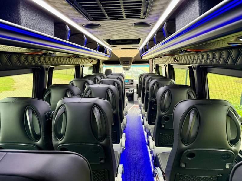 Fabrycznie nowy autobus Autobus dostępny od ręki ! Nr. oferty: 642 Mercedes-Benz Elegantbus Sprinter 519 EURO VI E 22+1+1 miejsc siedzących (Fotele zamontowane w szynach, możliwość zmiany na 19+1+1 miejsc i zwiększenie przestrzeni bagażowej) Wersja XXXL o długości 7, 87 m Pojemność: 1950 cm3 Pakiet stylistyczny Moc: 190 KM Rok produkcji: 2025 PODSTAWOWE I DODATKOWE WYPOSAŻENIE BAZOWE – ABS, SRS, ESP – Automatyczna 9 stopniowa skrzynia biegów – Reflektory przednie w technologii LED – Automatyczna zmiany świateł mijania - drogowe – Tylne lampy w technologii LED – Asystent utrzymania pasa ruchu – Tempo 100 km/h – Sensor świateł oraz deszczu – Tempomat – Kierownica wielofunkcyjna, trójramienna – Klimatyzacja dla kierowcy – Fotel kierowcy komfortowy z podłokietnikiem – Lusterko wsteczne – Asystent pasa ruchu FOTELE PRZEDZIAŁU PASAŻERSKIEGO – Komfortowe turystyczne fotele przedziału pasażerskiego (regulacja oparcia oraz przesuw boczny) – Fotele posiadają pasy bezpieczeństwa, podłokietniki, siateczki, stoliki, rączki, komfortowe zagłówki, – Fotele montowane na podestach – Fotel pilota na słupku B PRZESZKLENIE POJAZDU – Szyby podwójne, przyciemniane fabrycznie – Firanki przeciwsłoneczne na prowadnicach SYSTEMY GRZEWCZE – Konwektory grzewcze po lewej i prawej stronie – Ogrzewanie niezależne od pracy sinika mocy 5 kW z rozprowadzeniem KLIMATYZACJA – Automatyczna klimatyzacja dachowa o dużej wydajności 12, 5 KW OŚWIETLENIE – Oświetlenie indywidualne – Oświetlenie postojowe – Oświetlenie nocne – Podświetlane stopnie wejściowe – Podesty z podświetleniem LED – Lampy obrysowe dachowe MULTIMEDIA – System multimedialny MBUX 7, 5 ' – System Apple Car Play oraz Android Auto – Monitor podsufitowy 17 ' – Kamera Cofania – Mikrofon dynamiczny z potencjometrem – Nagłośnienie przestrzeni pasażerskiej PIONNER – Gniazda USB oraz USB C dla każdego rzędu siedzeń – Przetwornica 230v PRZECHOWYWANIE BAGAŻU I UBRAŃ – Turystyczne półki bagażowe – Pogłębiony tylny bagażnik – Wieszaki ubraniowe ELEMENTY BEZPIECZEŃSTWA – Podłoga antypoślizgowa PCV, odporna na ścieranie, wodoodporna – Szyberdach wentylacyjny / wyjście awaryjne – Młotki bezpieczeństwa – Dodatkowa gaśnica 2 kg ELEMENTY FUNKCJONALNE – Drzwi wejściowe elektryczne – Podwójny stopień wejściowy oświetlony LED – Przedłużenie pojazdu w tylnej części – Hak holowniczy z instalacją elektryczną – Lodówka 40 l LIFTING ZEWNĘTRZNY – Lakierowane zderzaki, listwy, klamki, lusterka i grill w kolorze pojazdu – Wszystkie dokładki lakierowane w kolor nadwozia Sprzedający: