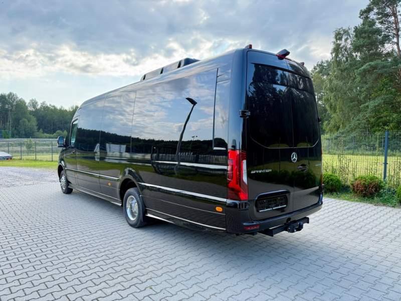 Fabrycznie nowy autobus Autobus dostępny od zaraz ! Nr. Oferty: 731 Mercedes-Benz Elegantbus Sprinter 519 EURO VI E GSR II 22+1+1 miejsc siedzących z możliwością szybkiej zmiany na 19+1+1 miejsc siedzących i zwiększenia przestrzeni bagażowej ! Wersja XXXL o długości 7, 87 m Pojemność: 1950 cm3 Pakiet stylistyczny Moc: 190 KM Rok produkcji: 2025 Kolor: Czarny PODSTAWOWE I DODATKOWE WYPOSAŻENIE BAZOWE – ABS, SRS, ESP – Wspomaganie kierownicy – Automatyczna 9 stopniowa skrzynia biegów – Centralny zamek, immobiliser – Reflektory przednie w technologii LED – Tylne lampy częściowo w technologii LED – Asystent utrzymania pasa ruchu – Tempo 100 km/h – Elektryczne szyby – Sensor świateł oraz deszczu – Tempomat – Kierownica wielofunkcyjna, trójramienna – Stabilizacja poziom II – Wzmocnione opony 205/75/R16C – Dogrzewacz elektryczny PTC – Klimatyzacja półautomatyczna TEMPTRONIC – Fotel kierowcy komfortowy z podłokietnikiem – Światła z funkcją świateł do jazdy dziennej – Lusterko wsteczne – Asystent pasa ruchu – Zamykany schowek na kokpicie – Akumulator AGM 12V 95 Ah – Lusterko wsteczne wewnętrzne – Zbiornik paliwa powiększony: 93 litry – Chlapacze przednie – Chlapacze tylnie FOTELE PRZEDZIAŁU PASAŻERSKIEGO – Komfortowe turystyczne fotele przedziału pasażerskiego (regulacja oparcia oraz przesuw boczny) – Fotele posiadają pasy bezpieczeństwa, podłokietniki, siateczki, stoliki, rączki, komfortowe zagłówki, – Fotele montowane na podestach – Fotel pilota na słupku B PRZESZKLENIE POJAZDU – Szyby podwójne, przyciemniane fabrycznie – Firanki przeciwsłoneczne na prowadnicach – Szyby drzwi elektrycznych podgrzewane SYSTEMY GRZEWCZE – Grzejniki konwektorowe wodne zainstalowane w przedziale pasażerskim po lewej i prawej stronie – Postojowe ogrzewanie wodne, oryginalne EBERSCHPRECHER 5 kW KLIMATYZACJA – Automatyczna Klimatyzacja dachowa WEBASTO 12, 5 kW OŚWIETLENIE – Oświetlenie indywidualne – Oświetlenie postojowe – Oświetlenie nocne – Podświetlane stopnie wejściowe – Podesty z podświetleniem LED – Lampy obrysowe dachowe LED MULTIMEDIA – System multimedialny MBUX 10, 5 cala – Oryginalna Kamera Cofania – Mikrofon – Nagłośnienie przestrzeni pasażerskiej PIONNER – Gniazda USB dla każdego rzędu siedzeń – Przetwornica 230v PRZECHOWYWANIE BAGAŻU I UBRAŃ – Turystyczne półki bagażowe – Lodówka o pojemności 40 litrów – Pogłębiony tylny bagażnik – Wieszaki ubraniowe ELEMENTY BEZPIECZEŃSTWA – Podłoga antypoślizgowa PCV, odporna na ścieranie, wodoodporna – Szyberdach wentylacyjny / wyjście awaryjne – Młotki bezpieczeństwa – Dodatkowa gaśnica 2 kg ELEMENTY FUNKCJONALNE – Elektryczne drzwi wejściowe sterowane z przycisku i pilota – Podwójny stopień wejściowy oświetlony LED – Przedłużenie pojazdu w tylnej części – Hak holowniczy LIFTING ZEWNĘTRZNY – Lakierowane zderzaki, listwy, klamki, lusterka i grill w kolorze pojazdu – Spojlery dolne w kolorze nadwozia Sprzedający: