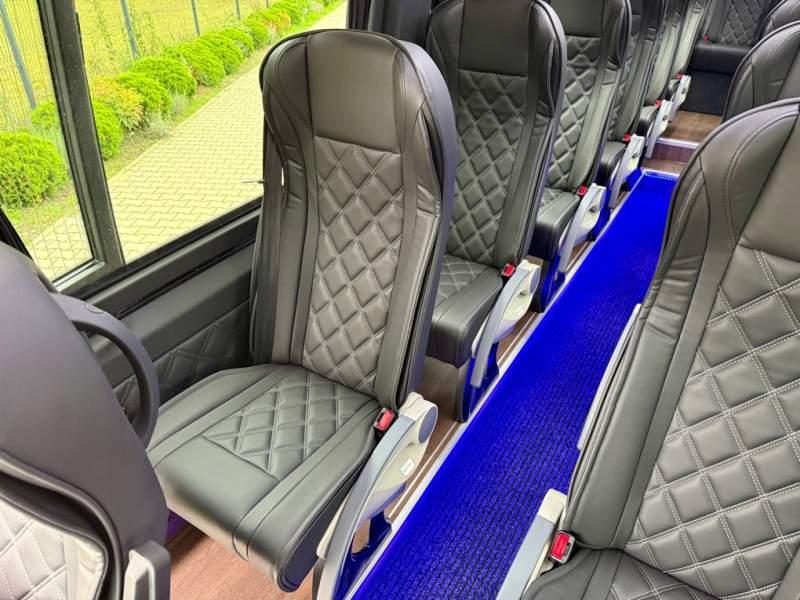 Fabrycznie nowy autobus Autobus dostępny od ręki ! Nr. oferty: 642 Mercedes-Benz Elegantbus Sprinter 519 EURO VI E 22+1+1 miejsc siedzących (Fotele zamontowane w szynach, możliwość zmiany na 19+1+1 miejsc i zwiększenie przestrzeni bagażowej) Wersja XXXL o długości 7, 87 m Pojemność: 1950 cm3 Pakiet stylistyczny Moc: 190 KM Rok produkcji: 2025 PODSTAWOWE I DODATKOWE WYPOSAŻENIE BAZOWE – ABS, SRS, ESP – Automatyczna 9 stopniowa skrzynia biegów – Reflektory przednie w technologii LED – Automatyczna zmiany świateł mijania - drogowe – Tylne lampy w technologii LED – Asystent utrzymania pasa ruchu – Tempo 100 km/h – Sensor świateł oraz deszczu – Tempomat – Kierownica wielofunkcyjna, trójramienna – Klimatyzacja dla kierowcy – Fotel kierowcy komfortowy z podłokietnikiem – Lusterko wsteczne – Asystent pasa ruchu FOTELE PRZEDZIAŁU PASAŻERSKIEGO – Komfortowe turystyczne fotele przedziału pasażerskiego (regulacja oparcia oraz przesuw boczny) – Fotele posiadają pasy bezpieczeństwa, podłokietniki, siateczki, stoliki, rączki, komfortowe zagłówki, – Fotele montowane na podestach – Fotel pilota na słupku B PRZESZKLENIE POJAZDU – Szyby podwójne, przyciemniane fabrycznie – Firanki przeciwsłoneczne na prowadnicach SYSTEMY GRZEWCZE – Konwektory grzewcze po lewej i prawej stronie – Ogrzewanie niezależne od pracy sinika mocy 5 kW z rozprowadzeniem KLIMATYZACJA – Automatyczna klimatyzacja dachowa o dużej wydajności 12, 5 KW OŚWIETLENIE – Oświetlenie indywidualne – Oświetlenie postojowe – Oświetlenie nocne – Podświetlane stopnie wejściowe – Podesty z podświetleniem LED – Lampy obrysowe dachowe MULTIMEDIA – System multimedialny MBUX 7, 5 ' – System Apple Car Play oraz Android Auto – Monitor podsufitowy 17 ' – Kamera Cofania – Mikrofon dynamiczny z potencjometrem – Nagłośnienie przestrzeni pasażerskiej PIONNER – Gniazda USB oraz USB C dla każdego rzędu siedzeń – Przetwornica 230v PRZECHOWYWANIE BAGAŻU I UBRAŃ – Turystyczne półki bagażowe – Pogłębiony tylny bagażnik – Wieszaki ubraniowe ELEMENTY BEZPIECZEŃSTWA – Podłoga antypoślizgowa PCV, odporna na ścieranie, wodoodporna – Szyberdach wentylacyjny / wyjście awaryjne – Młotki bezpieczeństwa – Dodatkowa gaśnica 2 kg ELEMENTY FUNKCJONALNE – Drzwi wejściowe elektryczne – Podwójny stopień wejściowy oświetlony LED – Przedłużenie pojazdu w tylnej części – Hak holowniczy z instalacją elektryczną – Lodówka 40 l LIFTING ZEWNĘTRZNY – Lakierowane zderzaki, listwy, klamki, lusterka i grill w kolorze pojazdu – Wszystkie dokładki lakierowane w kolor nadwozia Sprzedający: