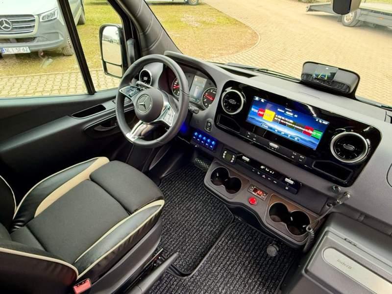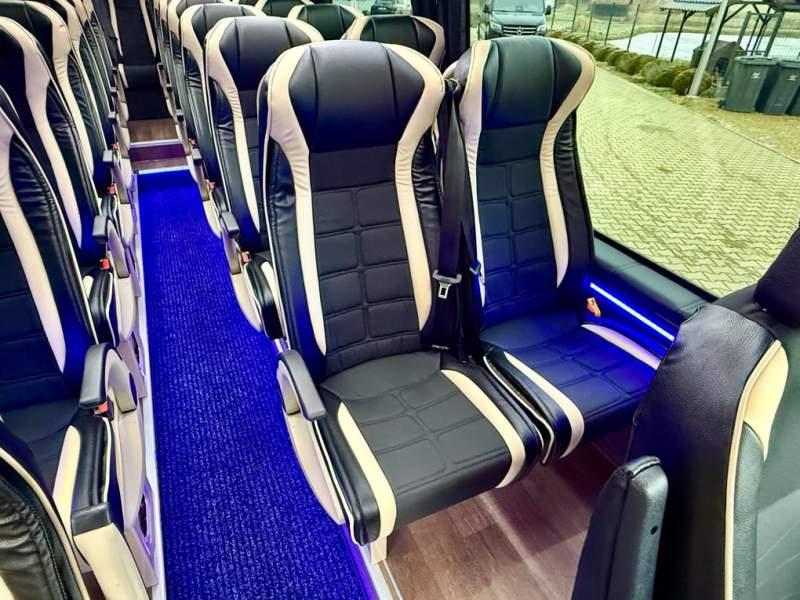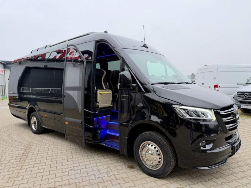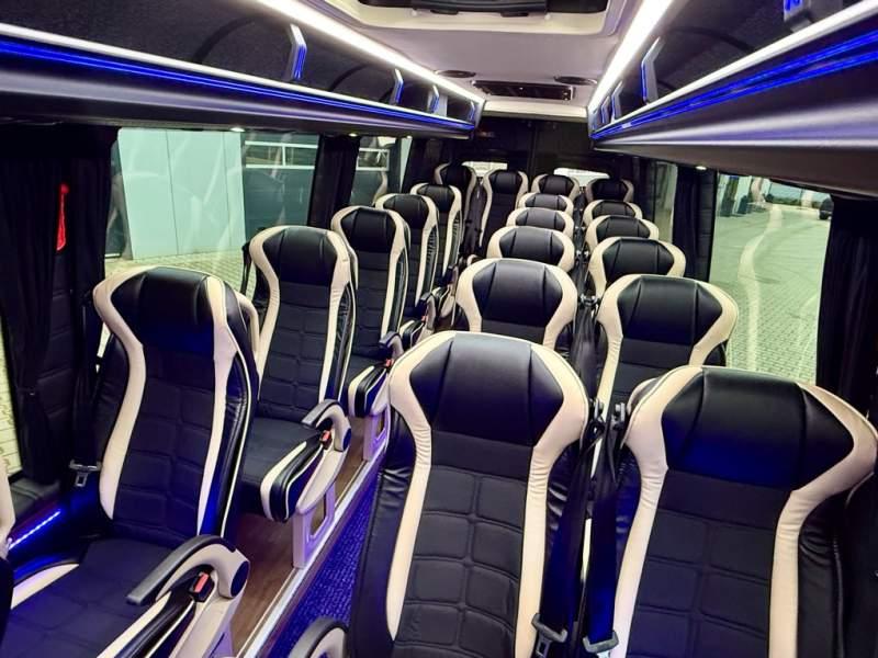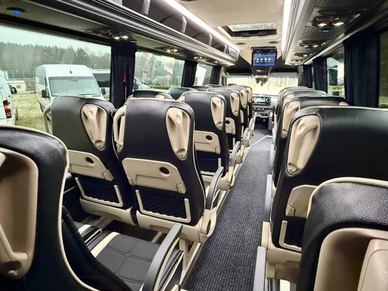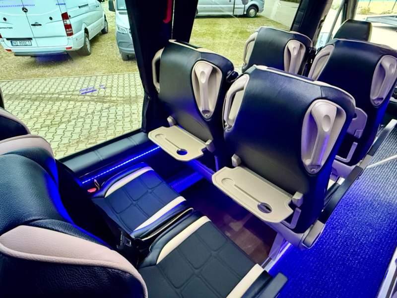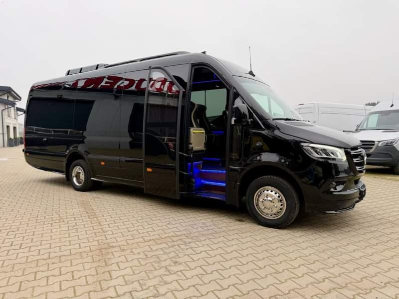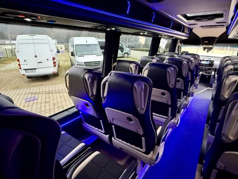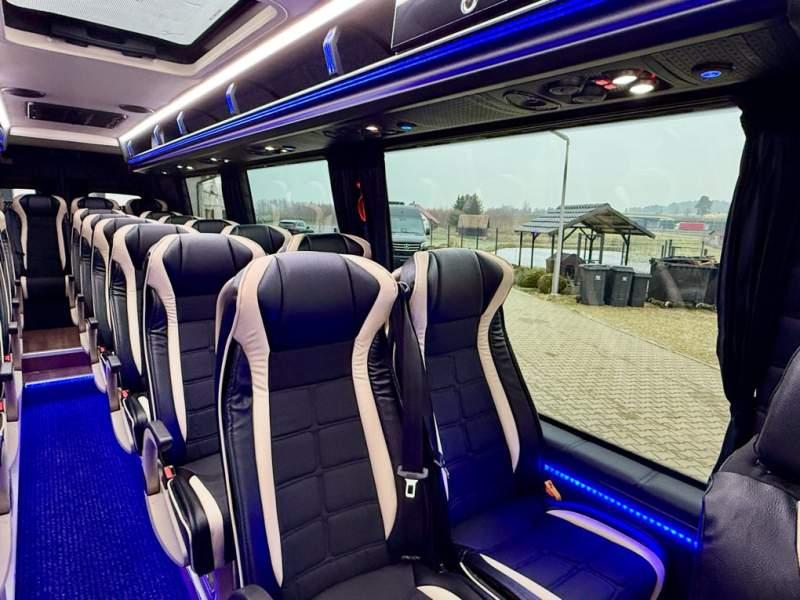 Fabrycznie nowy autobus Autobus dostępny od zaraz ! Nr. oferty: 897 Mercedes-Benz Elegantbus Sprinter 519 EURO VI E GSR II 22+1+1 miejsc siedzących z możliwością szybkiej zmiany na 19+1+1 miejsc siedzących i zwiększenia przestrzeni bagażowej ! Full Panorama Relingi dachowe Wersja XXXL o długości 7, 87 m Pojemność: 1950 cm3 Pakiet stylistyczny Moc: 190 KM Rok produkcji: 2025 Kolor: Czarny Obsidian Metalik PODSTAWOWE I DODATKOWE WYPOSAŻENIE BAZOWE – ABS, SRS, ESP – Wspomaganie kierownicy – Automatyczna 9 stopniowa skrzynia biegów – Centralny zamek, immobiliser – Reflektory przednie w technologii LED – Światła przeciwmgłowe przednie z funkcja doświetlania zakrętów – Tylne lampy częściowo w technologii LED – Asystent utrzymania pasa ruchu – Tempo 100 km/h – Elektryczne szyby – Sensor świateł oraz deszczu – Tempomat – Kierownica wielofunkcyjna, trójramienna – Stabilizacja poziom II – Wzmocnione opony 205/75/R16C – Dogrzewacz elektryczny PTC – Klimatyzacja półautomatyczna TEMPTRONIC – Fotel kierowcy komfortowy z podłokietnikiem – Światła z funkcją świateł do jazdy dziennej – Lusterko wsteczne – Asystent pasa ruchu – Zamykany schowek na kokpicie – Akumulator AGM 12V 95 Ah – Lusterko wsteczne wewnętrzne – Zbiornik paliwa powiększony: 93 litry – Chlapacze przednie – Chlapacze tylnie – Drugi akumulator w komorze silnika – Nawigacja satelitarna – Apple Car Play - Android Auto FOTELE PRZEDZIAŁU PASAŻERSKIEGO – Komfortowe turystyczne fotele przedziału pasażerskiego (regulacja oparcia oraz przesuw boczny) w kolorze jasno brązowym – Fotele posiadają pasy bezpieczeństwa, podłokietniki, siateczki, stoliki, rączki, komfortowe zagłówki, – Fotele montowane na podestach – Fotel pilota na słupku B PRZESZKLENIE POJAZDU – Szyby boczne panoramiczne – Szyby podwójne, przyciemniane fabrycznie – Firanki przeciwsłoneczne na prowadnicach – Szyby drzwi elektrycznych podgrzewane SYSTEMY GRZEWCZE – Grzejniki konwektorowe wodne zainstalowane w przedziale pasażerskim po lewej i prawej stronie – Postojowe ogrzewanie wodne, oryginalne EBERSCHPRECHER 5 kW KLIMATYZACJA – Automatyczna Klimatyzacja dachowa WEBASTO 12, 5 kW OŚWIETLENIE – Oświetlenie indywidualne – Oświetlenie postojowe – Oświetlenie nocne – Podświetlane stopnie wejściowe – Podesty z podświetleniem LED – Lampy obrysowe dachowe LED – Dodatkowe oświetlenie ambientowe na bokach pojazdu w listach imitacja mahoń MULTIMEDIA – System multimedialny MBUX 10, 5 cala – Oryginalna Kamera Cofania – Mikrofon – Nagłośnienie przestrzeni pasażerskiej PIONNER – Gniazda USB dla każdego rzędu siedzeń – Przetwornica 230v PRZECHOWYWANIE BAGAŻU I UBRAŃ – Turystyczne półki bagażowe – Lodówka o pojemności 40 litrów – Pogłębiony tylny bagażnik – Wieszaki ubraniowe ELEMENTY BEZPIECZEŃSTWA – Podłoga antypoślizgowa PCV, odporna na ścieranie, wodoodporna – Szyberdach wentylacyjny / wyjście awaryjne – Młotki bezpieczeństwa – Dodatkowa gaśnica 2 kg ELEMENTY FUNKCJONALNE – Elektryczne drzwi wejściowe – Dodatkowe sterowanie drzwi elektrycznych z pilota – Podwójny stopień wejściowy oświetlony LED – Przedłużenie pojazdu w tylnej części – Hak holowniczy LIFTING ZEWNĘTRZNY – Lakierowane zderzaki, listwy, klamki, lusterka i grill w kolorze pojazdu – Spojlery dolne w kolorze nadwozia – Relingi dachowe Sprzedający: