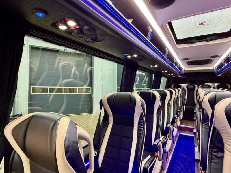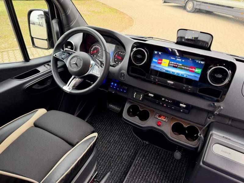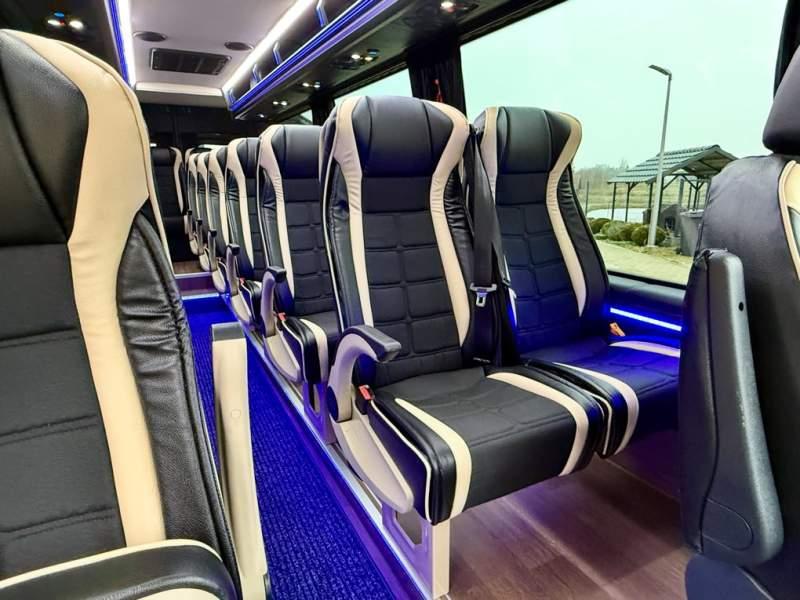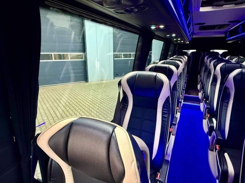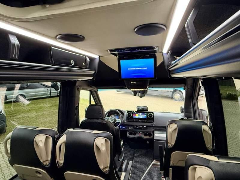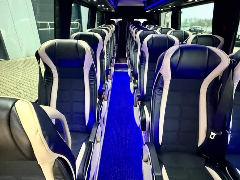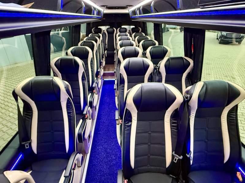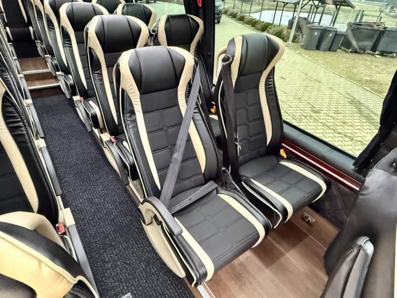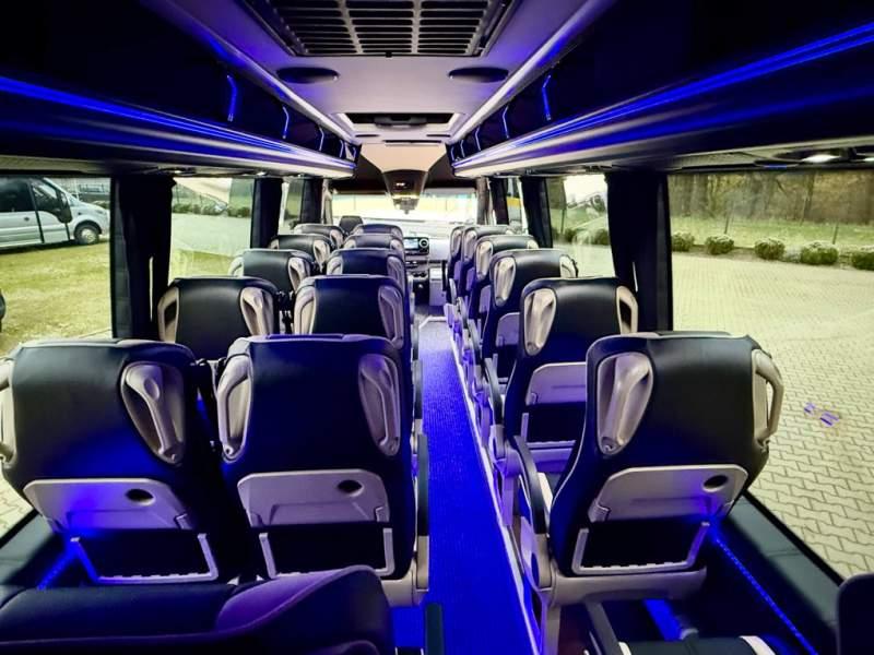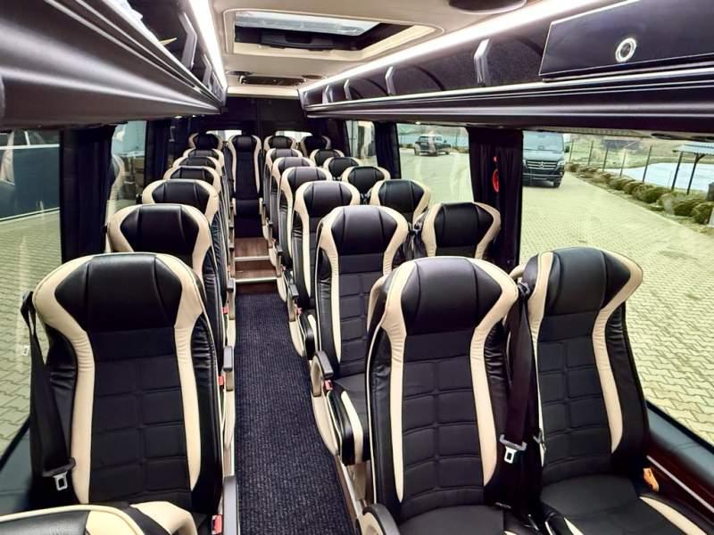 Fabrycznie nowy autobus Autobus dostępny od zaraz ! Nr. oferty: 897 Mercedes-Benz Elegantbus Sprinter 519 EURO VI E GSR II 22+1+1 miejsc siedzących z możliwością szybkiej zmiany na 19+1+1 miejsc siedzących i zwiększenia przestrzeni bagażowej ! Full Panorama Relingi dachowe Wersja XXXL o długości 7, 87 m Pojemność: 1950 cm3 Pakiet stylistyczny Moc: 190 KM Rok produkcji: 2025 Kolor: Czarny Obsidian Metalik PODSTAWOWE I DODATKOWE WYPOSAŻENIE BAZOWE – ABS, SRS, ESP – Wspomaganie kierownicy – Automatyczna 9 stopniowa skrzynia biegów – Centralny zamek, immobiliser – Reflektory przednie w technologii LED – Światła przeciwmgłowe przednie z funkcja doświetlania zakrętów – Tylne lampy częściowo w technologii LED – Asystent utrzymania pasa ruchu – Tempo 100 km/h – Elektryczne szyby – Sensor świateł oraz deszczu – Tempomat – Kierownica wielofunkcyjna, trójramienna – Stabilizacja poziom II – Wzmocnione opony 205/75/R16C – Dogrzewacz elektryczny PTC – Klimatyzacja półautomatyczna TEMPTRONIC – Fotel kierowcy komfortowy z podłokietnikiem – Światła z funkcją świateł do jazdy dziennej – Lusterko wsteczne – Asystent pasa ruchu – Zamykany schowek na kokpicie – Akumulator AGM 12V 95 Ah – Lusterko wsteczne wewnętrzne – Zbiornik paliwa powiększony: 93 litry – Chlapacze przednie – Chlapacze tylnie – Drugi akumulator w komorze silnika – Nawigacja satelitarna – Apple Car Play - Android Auto FOTELE PRZEDZIAŁU PASAŻERSKIEGO – Komfortowe turystyczne fotele przedziału pasażerskiego (regulacja oparcia oraz przesuw boczny) w kolorze jasno brązowym – Fotele posiadają pasy bezpieczeństwa, podłokietniki, siateczki, stoliki, rączki, komfortowe zagłówki, – Fotele montowane na podestach – Fotel pilota na słupku B PRZESZKLENIE POJAZDU – Szyby boczne panoramiczne – Szyby podwójne, przyciemniane fabrycznie – Firanki przeciwsłoneczne na prowadnicach – Szyby drzwi elektrycznych podgrzewane SYSTEMY GRZEWCZE – Grzejniki konwektorowe wodne zainstalowane w przedziale pasażerskim po lewej i prawej stronie – Postojowe ogrzewanie wodne, oryginalne EBERSCHPRECHER 5 kW KLIMATYZACJA – Automatyczna Klimatyzacja dachowa WEBASTO 12, 5 kW OŚWIETLENIE – Oświetlenie indywidualne – Oświetlenie postojowe – Oświetlenie nocne – Podświetlane stopnie wejściowe – Podesty z podświetleniem LED – Lampy obrysowe dachowe LED – Dodatkowe oświetlenie ambientowe na bokach pojazdu w listach imitacja mahoń MULTIMEDIA – System multimedialny MBUX 10, 5 cala – Oryginalna Kamera Cofania – Mikrofon – Nagłośnienie przestrzeni pasażerskiej PIONNER – Gniazda USB dla każdego rzędu siedzeń – Przetwornica 230v PRZECHOWYWANIE BAGAŻU I UBRAŃ – Turystyczne półki bagażowe – Lodówka o pojemności 40 litrów – Pogłębiony tylny bagażnik – Wieszaki ubraniowe ELEMENTY BEZPIECZEŃSTWA – Podłoga antypoślizgowa PCV, odporna na ścieranie, wodoodporna – Szyberdach wentylacyjny / wyjście awaryjne – Młotki bezpieczeństwa – Dodatkowa gaśnica 2 kg ELEMENTY FUNKCJONALNE – Elektryczne drzwi wejściowe – Dodatkowe sterowanie drzwi elektrycznych z pilota – Podwójny stopień wejściowy oświetlony LED – Przedłużenie pojazdu w tylnej części – Hak holowniczy LIFTING ZEWNĘTRZNY – Lakierowane zderzaki, listwy, klamki, lusterka i grill w kolorze pojazdu – Spojlery dolne w kolorze nadwozia – Relingi dachowe Sprzedający: