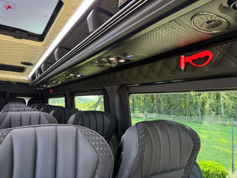 Fabrycznie nowy autobus Autobus dostępny od zaraz ! Nr. oferty: 187 Mercedes-Benz Elegantbus Sprinter 519 EURO VI E GSR II 22+1+1 miejsc siedzących z możliwością szybkiej zmiany na 19+1+1 miejsc siedzących i zwiększenia przestrzeni bagażowej ! Full Panorama Relingi dachowe Wersja XXXL o długości 7, 87 m Pojemność: 1950 cm3 Pakiet stylistyczny Moc: 190 KM Rok produkcji: 2025 Kolor: Srebrny Metalik PODSTAWOWE I DODATKOWE WYPOSAŻENIE BAZOWE – ABS, SRS, ESP – Wspomaganie kierownicy – Automatyczna 9 stopniowa skrzynia biegów – Centralny zamek, immobiliser – Reflektory przednie w technologii LED – Tylne lampy częściowo w technologii LED – Asystent utrzymania pasa ruchu – Tempo 100 km/h – Elektryczne szyby – Sensor świateł oraz deszczu – Tempomat – Kierownica wielofunkcyjna, trójramienna – Stabilizacja poziom II – Wzmocnione opony 205/75/R16C – Dogrzewacz elektryczny PTC – Klimatyzacja półautomatyczna TEMPTRONIC – Fotel kierowcy komfortowy z podłokietnikiem – Światła z funkcją świateł do jazdy dziennej – Lusterko wsteczne – Asystent pasa ruchu – Zamykany schowek na kokpicie – Akumulator AGM 12V 95 Ah – Lusterko wsteczne wewnętrzne – Zbiornik paliwa powiększony: 93 litry – Chlapacze przednie – Chlapacze tylnie FOTELE PRZEDZIAŁU PASAŻERSKIEGO – Komfortowe turystyczne fotele przedziału pasażerskiego (regulacja oparcia oraz przesuw boczny) w kolorze jasno brązowym – Fotele posiadają pasy bezpieczeństwa, podłokietniki, siateczki, stoliki, rączki, komfortowe zagłówki, – Fotele montowane na podestach – Fotel pilota na słupku B PRZESZKLENIE POJAZDU – Szyby podwójne, przyciemniane fabrycznie – Firanki przeciwsłoneczne na prowadnicach – Szyby drzwi elektrycznych podgrzewane SYSTEMY GRZEWCZE – Grzejniki konwektorowe wodne zainstalowane w przedziale pasażerskim po lewej i prawej stronie – Postojowe ogrzewanie wodne, oryginalne EBERSCHPRECHER 5 kW KLIMATYZACJA – Automatyczna Klimatyzacja dachowa WEBASTO 12, 5 kW OŚWIETLENIE – Oświetlenie indywidualne – Oświetlenie postojowe – Oświetlenie nocne – Podświetlane stopnie wejściowe – Podesty z podświetleniem LED – Lampy obrysowe dachowe LED MULTIMEDIA – System multimedialny MBUX 10, 5 cala – Oryginalna Kamera Cofania – Mikrofon – Nagłośnienie przestrzeni pasażerskiej PIONNER – Gniazda USB dla każdego rzędu siedzeń – Przetwornica 230v PRZECHOWYWANIE BAGAŻU I UBRAŃ – Turystyczne półki bagażowe – Lodówka o pojemności 40 litrów – Pogłębiony tylny bagażnik – Wieszaki ubraniowe ELEMENTY BEZPIECZEŃSTWA – Podłoga antypoślizgowa PCV, odporna na ścieranie, wodoodporna – Szyberdach wentylacyjny / wyjście awaryjne – Młotki bezpieczeństwa – Dodatkowa gaśnica 2 kg ELEMENTY FUNKCJONALNE – Elektryczne drzwi wejściowe sterowane z przycisku i pilota – Podwójny stopień wejściowy oświetlony LED – Przedłużenie pojazdu w tylnej części – Hak holowniczy LIFTING ZEWNĘTRZNY – Lakierowane zderzaki, listwy, klamki, lusterka i grill w kolorze pojazdu – Spojlery dolne w kolorze nadwozia Sprzedający:
