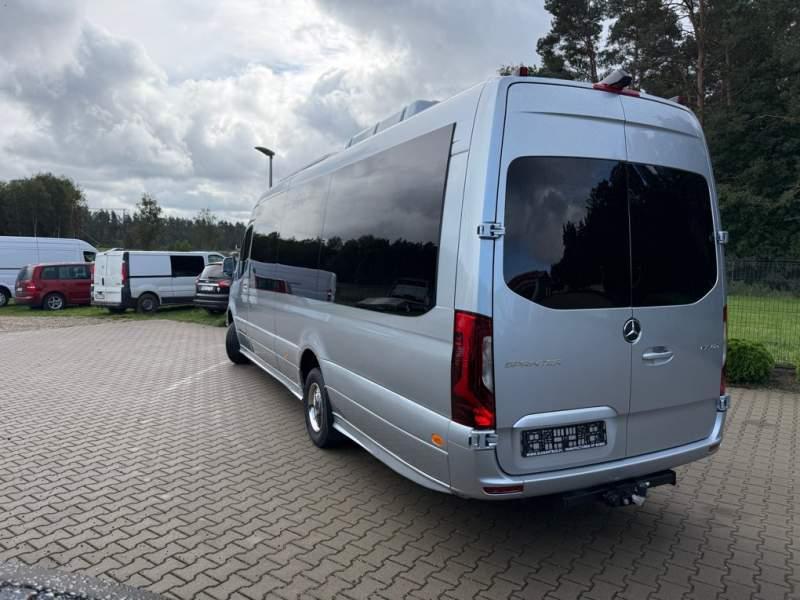 Fabrycznie nowy autobus Autobus dostępny od zaraz ! Nr. oferty: 187 Mercedes-Benz Elegantbus Sprinter 519 EURO VI E GSR II 22+1+1 miejsc siedzących z możliwością szybkiej zmiany na 19+1+1 miejsc siedzących i zwiększenia przestrzeni bagażowej ! Full Panorama Relingi dachowe Wersja XXXL o długości 7, 87 m Pojemność: 1950 cm3 Pakiet stylistyczny Moc: 190 KM Rok produkcji: 2025 Kolor: Srebrny Metalik PODSTAWOWE I DODATKOWE WYPOSAŻENIE BAZOWE – ABS, SRS, ESP – Wspomaganie kierownicy – Automatyczna 9 stopniowa skrzynia biegów – Centralny zamek, immobiliser – Reflektory przednie w technologii LED – Tylne lampy częściowo w technologii LED – Asystent utrzymania pasa ruchu – Tempo 100 km/h – Elektryczne szyby – Sensor świateł oraz deszczu – Tempomat – Kierownica wielofunkcyjna, trójramienna – Stabilizacja poziom II – Wzmocnione opony 205/75/R16C – Dogrzewacz elektryczny PTC – Klimatyzacja półautomatyczna TEMPTRONIC – Fotel kierowcy komfortowy z podłokietnikiem – Światła z funkcją świateł do jazdy dziennej – Lusterko wsteczne – Asystent pasa ruchu – Zamykany schowek na kokpicie – Akumulator AGM 12V 95 Ah – Lusterko wsteczne wewnętrzne – Zbiornik paliwa powiększony: 93 litry – Chlapacze przednie – Chlapacze tylnie FOTELE PRZEDZIAŁU PASAŻERSKIEGO – Komfortowe turystyczne fotele przedziału pasażerskiego (regulacja oparcia oraz przesuw boczny) w kolorze jasno brązowym – Fotele posiadają pasy bezpieczeństwa, podłokietniki, siateczki, stoliki, rączki, komfortowe zagłówki, – Fotele montowane na podestach – Fotel pilota na słupku B PRZESZKLENIE POJAZDU – Szyby podwójne, przyciemniane fabrycznie – Firanki przeciwsłoneczne na prowadnicach – Szyby drzwi elektrycznych podgrzewane SYSTEMY GRZEWCZE – Grzejniki konwektorowe wodne zainstalowane w przedziale pasażerskim po lewej i prawej stronie – Postojowe ogrzewanie wodne, oryginalne EBERSCHPRECHER 5 kW KLIMATYZACJA – Automatyczna Klimatyzacja dachowa WEBASTO 12, 5 kW OŚWIETLENIE – Oświetlenie indywidualne – Oświetlenie postojowe – Oświetlenie nocne – Podświetlane stopnie wejściowe – Podesty z podświetleniem LED – Lampy obrysowe dachowe LED MULTIMEDIA – System multimedialny MBUX 10, 5 cala – Oryginalna Kamera Cofania – Mikrofon – Nagłośnienie przestrzeni pasażerskiej PIONNER – Gniazda USB dla każdego rzędu siedzeń – Przetwornica 230v PRZECHOWYWANIE BAGAŻU I UBRAŃ – Turystyczne półki bagażowe – Lodówka o pojemności 40 litrów – Pogłębiony tylny bagażnik – Wieszaki ubraniowe ELEMENTY BEZPIECZEŃSTWA – Podłoga antypoślizgowa PCV, odporna na ścieranie, wodoodporna – Szyberdach wentylacyjny / wyjście awaryjne – Młotki bezpieczeństwa – Dodatkowa gaśnica 2 kg ELEMENTY FUNKCJONALNE – Elektryczne drzwi wejściowe sterowane z przycisku i pilota – Podwójny stopień wejściowy oświetlony LED – Przedłużenie pojazdu w tylnej części – Hak holowniczy LIFTING ZEWNĘTRZNY – Lakierowane zderzaki, listwy, klamki, lusterka i grill w kolorze pojazdu – Spojlery dolne w kolorze nadwozia Sprzedający: