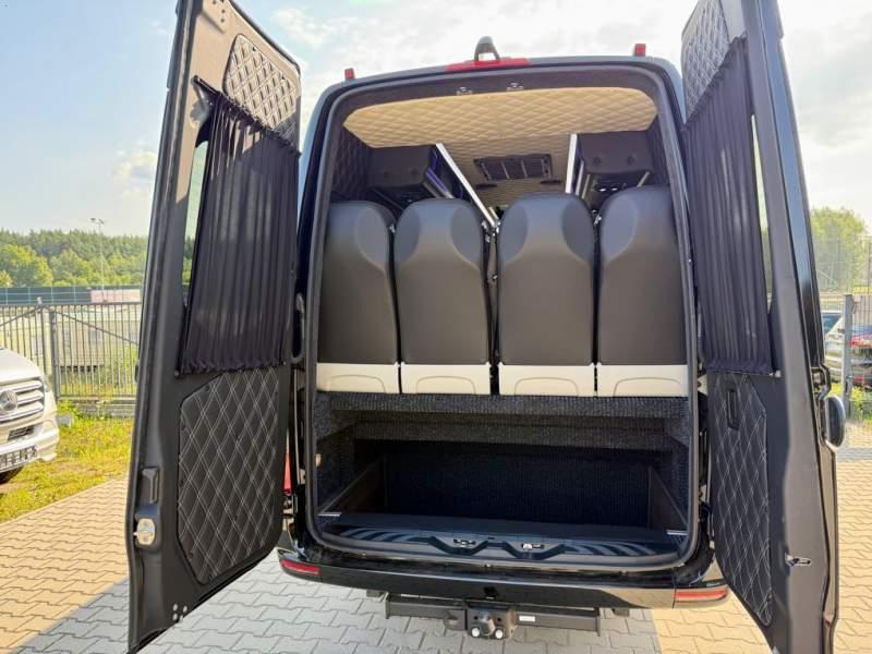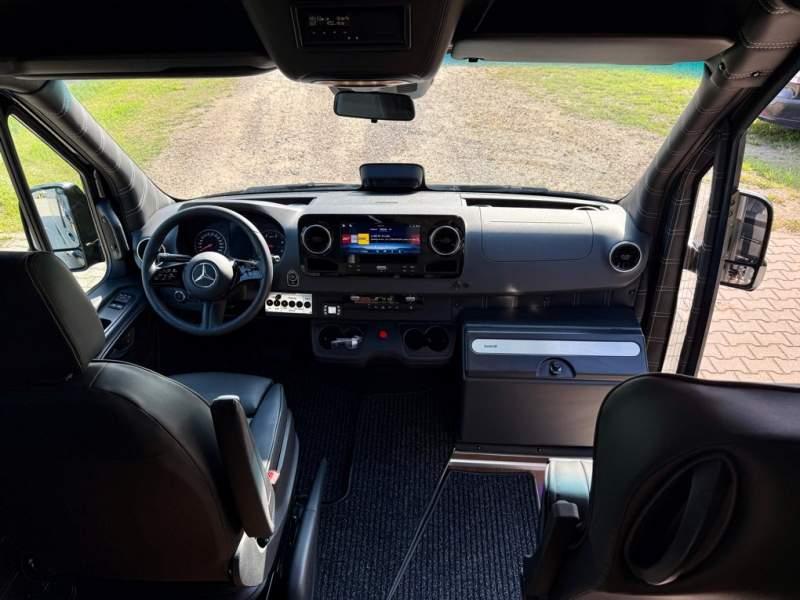 Fabrycznie nowy autobus Autobus dostępny od zaraz ! Nr. Oferty: 731 Mercedes-Benz Elegantbus Sprinter 519 EURO VI E GSR II 22+1+1 miejsc siedzących z możliwością szybkiej zmiany na 19+1+1 miejsc siedzących i zwiększenia przestrzeni bagażowej ! Wersja XXXL o długości 7, 87 m Pojemność: 1950 cm3 Pakiet stylistyczny Moc: 190 KM Rok produkcji: 2025 Kolor: Czarny PODSTAWOWE I DODATKOWE WYPOSAŻENIE BAZOWE – ABS, SRS, ESP – Wspomaganie kierownicy – Automatyczna 9 stopniowa skrzynia biegów – Centralny zamek, immobiliser – Reflektory przednie w technologii LED – Tylne lampy częściowo w technologii LED – Asystent utrzymania pasa ruchu – Tempo 100 km/h – Elektryczne szyby – Sensor świateł oraz deszczu – Tempomat – Kierownica wielofunkcyjna, trójramienna – Stabilizacja poziom II – Wzmocnione opony 205/75/R16C – Dogrzewacz elektryczny PTC – Klimatyzacja półautomatyczna TEMPTRONIC – Fotel kierowcy komfortowy z podłokietnikiem – Światła z funkcją świateł do jazdy dziennej – Lusterko wsteczne – Asystent pasa ruchu – Zamykany schowek na kokpicie – Akumulator AGM 12V 95 Ah – Lusterko wsteczne wewnętrzne – Zbiornik paliwa powiększony: 93 litry – Chlapacze przednie – Chlapacze tylnie FOTELE PRZEDZIAŁU PASAŻERSKIEGO – Komfortowe turystyczne fotele przedziału pasażerskiego (regulacja oparcia oraz przesuw boczny) – Fotele posiadają pasy bezpieczeństwa, podłokietniki, siateczki, stoliki, rączki, komfortowe zagłówki, – Fotele montowane na podestach – Fotel pilota na słupku B PRZESZKLENIE POJAZDU – Szyby podwójne, przyciemniane fabrycznie – Firanki przeciwsłoneczne na prowadnicach – Szyby drzwi elektrycznych podgrzewane SYSTEMY GRZEWCZE – Grzejniki konwektorowe wodne zainstalowane w przedziale pasażerskim po lewej i prawej stronie – Postojowe ogrzewanie wodne, oryginalne EBERSCHPRECHER 5 kW KLIMATYZACJA – Automatyczna Klimatyzacja dachowa WEBASTO 12, 5 kW OŚWIETLENIE – Oświetlenie indywidualne – Oświetlenie postojowe – Oświetlenie nocne – Podświetlane stopnie wejściowe – Podesty z podświetleniem LED – Lampy obrysowe dachowe LED MULTIMEDIA – System multimedialny MBUX 10, 5 cala – Oryginalna Kamera Cofania – Mikrofon – Nagłośnienie przestrzeni pasażerskiej PIONNER – Gniazda USB dla każdego rzędu siedzeń – Przetwornica 230v PRZECHOWYWANIE BAGAŻU I UBRAŃ – Turystyczne półki bagażowe – Lodówka o pojemności 40 litrów – Pogłębiony tylny bagażnik – Wieszaki ubraniowe ELEMENTY BEZPIECZEŃSTWA – Podłoga antypoślizgowa PCV, odporna na ścieranie, wodoodporna – Szyberdach wentylacyjny / wyjście awaryjne – Młotki bezpieczeństwa – Dodatkowa gaśnica 2 kg ELEMENTY FUNKCJONALNE – Elektryczne drzwi wejściowe sterowane z przycisku i pilota – Podwójny stopień wejściowy oświetlony LED – Przedłużenie pojazdu w tylnej części – Hak holowniczy LIFTING ZEWNĘTRZNY – Lakierowane zderzaki, listwy, klamki, lusterka i grill w kolorze pojazdu – Spojlery dolne w kolorze nadwozia Sprzedający: