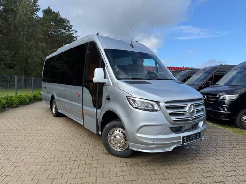 Fabrycznie nowy autobus Autobus dostępny od zaraz ! Nr. oferty: 187 Mercedes-Benz Elegantbus Sprinter 519 EURO VI E GSR II 22+1+1 miejsc siedzących z możliwością szybkiej zmiany na 19+1+1 miejsc siedzących i zwiększenia przestrzeni bagażowej ! Full Panorama Relingi dachowe Wersja XXXL o długości 7, 87 m Pojemność: 1950 cm3 Pakiet stylistyczny Moc: 190 KM Rok produkcji: 2025 Kolor: Srebrny Metalik PODSTAWOWE I DODATKOWE WYPOSAŻENIE BAZOWE – ABS, SRS, ESP – Wspomaganie kierownicy – Automatyczna 9 stopniowa skrzynia biegów – Centralny zamek, immobiliser – Reflektory przednie w technologii LED – Tylne lampy częściowo w technologii LED – Asystent utrzymania pasa ruchu – Tempo 100 km/h – Elektryczne szyby – Sensor świateł oraz deszczu – Tempomat – Kierownica wielofunkcyjna, trójramienna – Stabilizacja poziom II – Wzmocnione opony 205/75/R16C – Dogrzewacz elektryczny PTC – Klimatyzacja półautomatyczna TEMPTRONIC – Fotel kierowcy komfortowy z podłokietnikiem – Światła z funkcją świateł do jazdy dziennej – Lusterko wsteczne – Asystent pasa ruchu – Zamykany schowek na kokpicie – Akumulator AGM 12V 95 Ah – Lusterko wsteczne wewnętrzne – Zbiornik paliwa powiększony: 93 litry – Chlapacze przednie – Chlapacze tylnie FOTELE PRZEDZIAŁU PASAŻERSKIEGO – Komfortowe turystyczne fotele przedziału pasażerskiego (regulacja oparcia oraz przesuw boczny) w kolorze jasno brązowym – Fotele posiadają pasy bezpieczeństwa, podłokietniki, siateczki, stoliki, rączki, komfortowe zagłówki, – Fotele montowane na podestach – Fotel pilota na słupku B PRZESZKLENIE POJAZDU – Szyby podwójne, przyciemniane fabrycznie – Firanki przeciwsłoneczne na prowadnicach – Szyby drzwi elektrycznych podgrzewane SYSTEMY GRZEWCZE – Grzejniki konwektorowe wodne zainstalowane w przedziale pasażerskim po lewej i prawej stronie – Postojowe ogrzewanie wodne, oryginalne EBERSCHPRECHER 5 kW KLIMATYZACJA – Automatyczna Klimatyzacja dachowa WEBASTO 12, 5 kW OŚWIETLENIE – Oświetlenie indywidualne – Oświetlenie postojowe – Oświetlenie nocne – Podświetlane stopnie wejściowe – Podesty z podświetleniem LED – Lampy obrysowe dachowe LED MULTIMEDIA – System multimedialny MBUX 10, 5 cala – Oryginalna Kamera Cofania – Mikrofon – Nagłośnienie przestrzeni pasażerskiej PIONNER – Gniazda USB dla każdego rzędu siedzeń – Przetwornica 230v PRZECHOWYWANIE BAGAŻU I UBRAŃ – Turystyczne półki bagażowe – Lodówka o pojemności 40 litrów – Pogłębiony tylny bagażnik – Wieszaki ubraniowe ELEMENTY BEZPIECZEŃSTWA – Podłoga antypoślizgowa PCV, odporna na ścieranie, wodoodporna – Szyberdach wentylacyjny / wyjście awaryjne – Młotki bezpieczeństwa – Dodatkowa gaśnica 2 kg ELEMENTY FUNKCJONALNE – Elektryczne drzwi wejściowe sterowane z przycisku i pilota – Podwójny stopień wejściowy oświetlony LED – Przedłużenie pojazdu w tylnej części – Hak holowniczy LIFTING ZEWNĘTRZNY – Lakierowane zderzaki, listwy, klamki, lusterka i grill w kolorze pojazdu – Spojlery dolne w kolorze nadwozia Sprzedający: