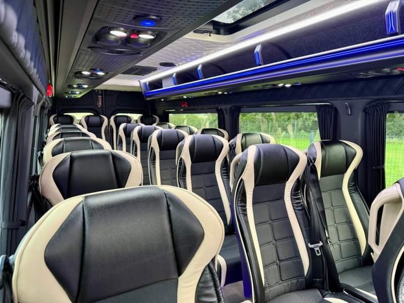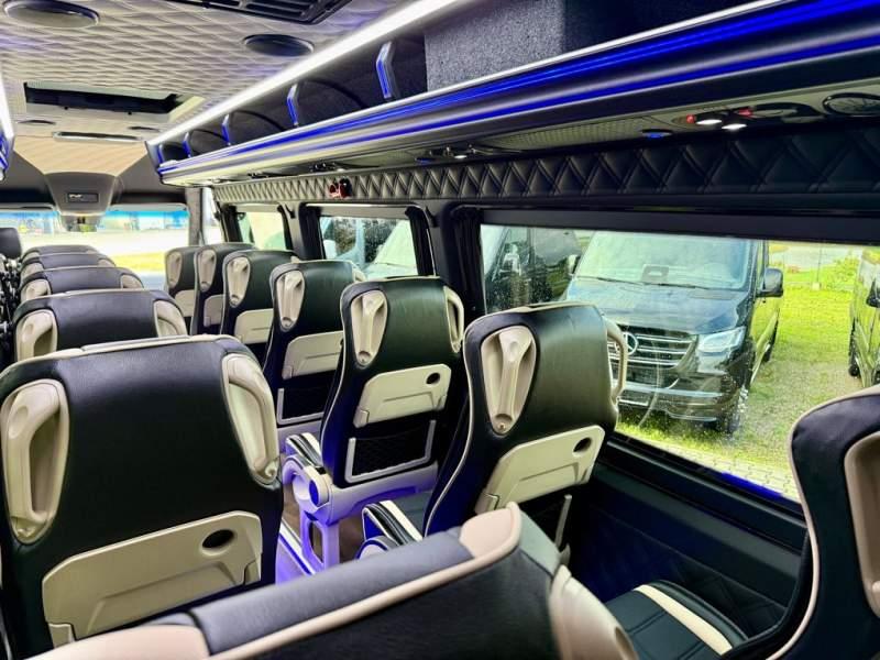 Fabrycznie nowy autobus Autobus dostępny od ręki ! Nr. oferty: 100 Mercedes-Benz Elegantbus Sprinter 519 EURO VI E 22+1+1 miejsc siedzących (Fotele zamontowane w szynach, możliwość zmiany na 19+1+1 miejsc i zwiększenie przestrzeni bagażowej) Wersja XXXL o długości 7, 87 m Pojemność: 1950 cm3 Pakiet stylistyczny Moc: 190 KM Rok produkcji: 2025 PODSTAWOWE I DODATKOWE WYPOSAŻENIE BAZOWE – ABS, SRS, ESP – Automatyczna 9 stopniowa skrzynia biegów – Reflektory przednie w technologii LED – Automatyczna zmiany świateł mijania - drogowe – Tylne lampy w technologii LED – Asystent utrzymania pasa ruchu – Tempo 100 km/h – Sensor świateł oraz deszczu – Tempomat – Kierownica wielofunkcyjna, trójramienna – Klimatyzacja dla kierowcy – Fotel kierowcy komfortowy z podłokietnikiem – Lusterko wsteczne – Asystent pasa ruchu FOTELE PRZEDZIAŁU PASAŻERSKIEGO – Komfortowe turystyczne fotele przedziału pasażerskiego (regulacja oparcia oraz przesuw boczny) – Fotele posiadają pasy bezpieczeństwa, podłokietniki, siateczki, stoliki, rączki, komfortowe zagłówki, – Fotele montowane na podestach – Fotel pilota na słupku B PRZESZKLENIE POJAZDU – Szyby podwójne, przyciemniane fabrycznie – Firanki przeciwsłoneczne na prowadnicach SYSTEMY GRZEWCZE – Konwektory grzewcze po lewej i prawej stronie – Ogrzewanie niezależne od pracy sinika mocy 5 kW z rozprowadzeniem KLIMATYZACJA – Automatyczna klimatyzacja dachowa o dużej wydajności 12, 5 KW OŚWIETLENIE – Oświetlenie indywidualne – Oświetlenie postojowe – Oświetlenie nocne – Podświetlane stopnie wejściowe – Podesty z podświetleniem LED – Lampy obrysowe dachowe MULTIMEDIA – System multimedialny MBUX 7, 5 ' – System Apple Car Play oraz Android Auto – Monitor podsufitowy 17 ' – Kamera Cofania – Mikrofon dynamiczny z potencjometrem – Nagłośnienie przestrzeni pasażerskiej PIONNER – Gniazda USB oraz USB C dla każdego rzędu siedzeń – Przetwornica 230v PRZECHOWYWANIE BAGAŻU I UBRAŃ – Turystyczne półki bagażowe – Pogłębiony tylny bagażnik – Wieszaki ubraniowe ELEMENTY BEZPIECZEŃSTWA – Podłoga antypoślizgowa PCV, odporna na ścieranie, wodoodporna – Szyberdach wentylacyjny / wyjście awaryjne – Młotki bezpieczeństwa – Dodatkowa gaśnica 2 kg ELEMENTY FUNKCJONALNE – Drzwi wejściowe elektryczne – Podwójny stopień wejściowy oświetlony LED – Przedłużenie pojazdu w tylnej części – Hak holowniczy z instalacją elektryczną – Lodówka 40 l LIFTING ZEWNĘTRZNY – Lakierowane zderzaki, listwy, klamki, lusterka i grill w kolorze pojazdu – Wszystkie dokładki lakierowane w kolor nadwozia Sprzedający: