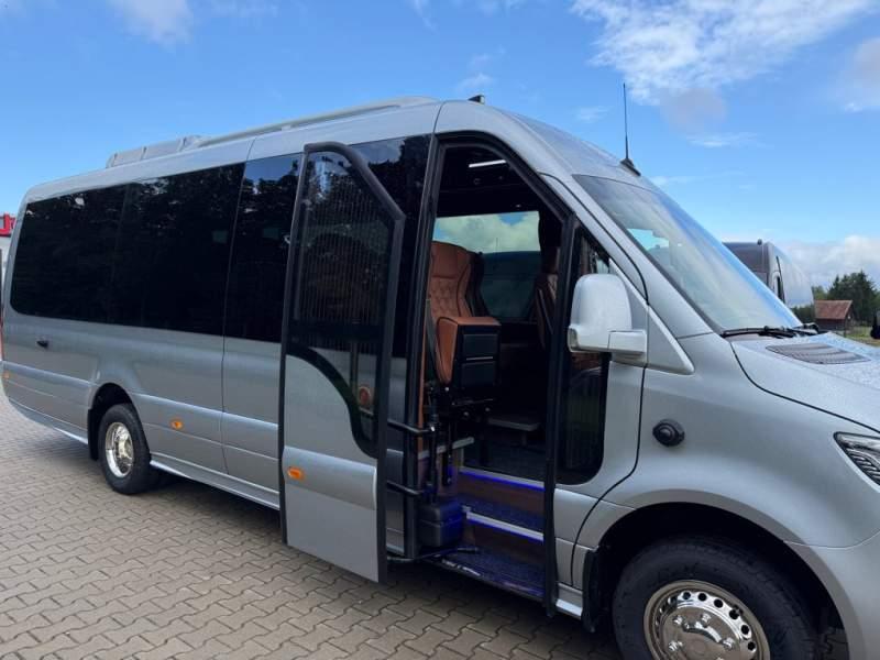 Fabrycznie nowy autobus Autobus dostępny od zaraz ! Nr. oferty: 187 Mercedes-Benz Elegantbus Sprinter 519 EURO VI E GSR II 22+1+1 miejsc siedzących z możliwością szybkiej zmiany na 19+1+1 miejsc siedzących i zwiększenia przestrzeni bagażowej ! Full Panorama Relingi dachowe Wersja XXXL o długości 7, 87 m Pojemność: 1950 cm3 Pakiet stylistyczny Moc: 190 KM Rok produkcji: 2025 Kolor: Srebrny Metalik PODSTAWOWE I DODATKOWE WYPOSAŻENIE BAZOWE – ABS, SRS, ESP – Wspomaganie kierownicy – Automatyczna 9 stopniowa skrzynia biegów – Centralny zamek, immobiliser – Reflektory przednie w technologii LED – Tylne lampy częściowo w technologii LED – Asystent utrzymania pasa ruchu – Tempo 100 km/h – Elektryczne szyby – Sensor świateł oraz deszczu – Tempomat – Kierownica wielofunkcyjna, trójramienna – Stabilizacja poziom II – Wzmocnione opony 205/75/R16C – Dogrzewacz elektryczny PTC – Klimatyzacja półautomatyczna TEMPTRONIC – Fotel kierowcy komfortowy z podłokietnikiem – Światła z funkcją świateł do jazdy dziennej – Lusterko wsteczne – Asystent pasa ruchu – Zamykany schowek na kokpicie – Akumulator AGM 12V 95 Ah – Lusterko wsteczne wewnętrzne – Zbiornik paliwa powiększony: 93 litry – Chlapacze przednie – Chlapacze tylnie FOTELE PRZEDZIAŁU PASAŻERSKIEGO – Komfortowe turystyczne fotele przedziału pasażerskiego (regulacja oparcia oraz przesuw boczny) w kolorze jasno brązowym – Fotele posiadają pasy bezpieczeństwa, podłokietniki, siateczki, stoliki, rączki, komfortowe zagłówki, – Fotele montowane na podestach – Fotel pilota na słupku B PRZESZKLENIE POJAZDU – Szyby podwójne, przyciemniane fabrycznie – Firanki przeciwsłoneczne na prowadnicach – Szyby drzwi elektrycznych podgrzewane SYSTEMY GRZEWCZE – Grzejniki konwektorowe wodne zainstalowane w przedziale pasażerskim po lewej i prawej stronie – Postojowe ogrzewanie wodne, oryginalne EBERSCHPRECHER 5 kW KLIMATYZACJA – Automatyczna Klimatyzacja dachowa WEBASTO 12, 5 kW OŚWIETLENIE – Oświetlenie indywidualne – Oświetlenie postojowe – Oświetlenie nocne – Podświetlane stopnie wejściowe – Podesty z podświetleniem LED – Lampy obrysowe dachowe LED MULTIMEDIA – System multimedialny MBUX 10, 5 cala – Oryginalna Kamera Cofania – Mikrofon – Nagłośnienie przestrzeni pasażerskiej PIONNER – Gniazda USB dla każdego rzędu siedzeń – Przetwornica 230v PRZECHOWYWANIE BAGAŻU I UBRAŃ – Turystyczne półki bagażowe – Lodówka o pojemności 40 litrów – Pogłębiony tylny bagażnik – Wieszaki ubraniowe ELEMENTY BEZPIECZEŃSTWA – Podłoga antypoślizgowa PCV, odporna na ścieranie, wodoodporna – Szyberdach wentylacyjny / wyjście awaryjne – Młotki bezpieczeństwa – Dodatkowa gaśnica 2 kg ELEMENTY FUNKCJONALNE – Elektryczne drzwi wejściowe sterowane z przycisku i pilota – Podwójny stopień wejściowy oświetlony LED – Przedłużenie pojazdu w tylnej części – Hak holowniczy LIFTING ZEWNĘTRZNY – Lakierowane zderzaki, listwy, klamki, lusterka i grill w kolorze pojazdu – Spojlery dolne w kolorze nadwozia Sprzedający: